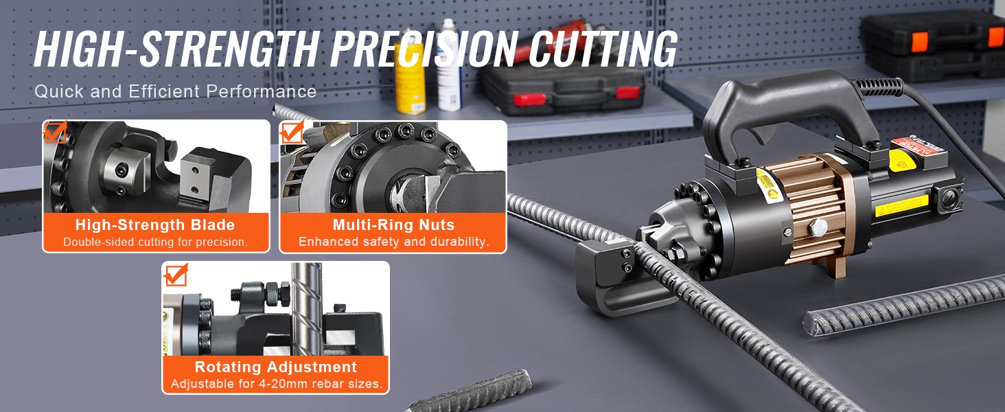 Kaksipuoliset, korkealaatuiset terät on suunniteltu leikkaamaan raudoitetta molemmilta puolilta. Monirengasmutteri lisää käyttöturvallisuutta ja sen säätö helpottaa erikokoisten raudoitusten katkaisua.