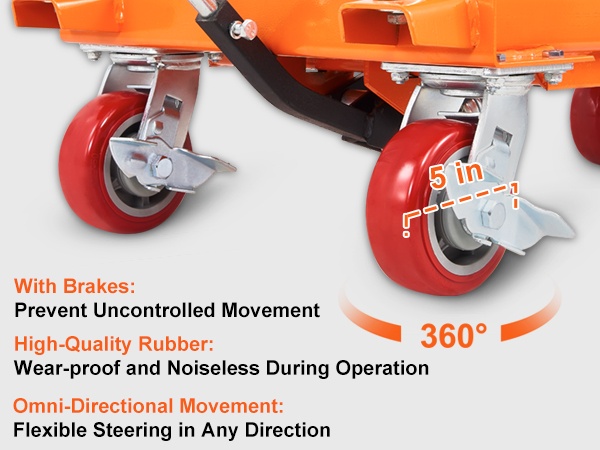 Hydraulisessa saksivaunussa on suorituskykyiset kääntöpyörät, jotka pyörivät useaan suuntaan ja joissa on lukitusmekanismi. Kulutusta ja korroosiota kestävät pyörät helpottavat raskaittenkin kuormien hallittua ja turvallista siirtämistä.