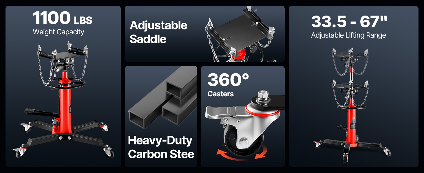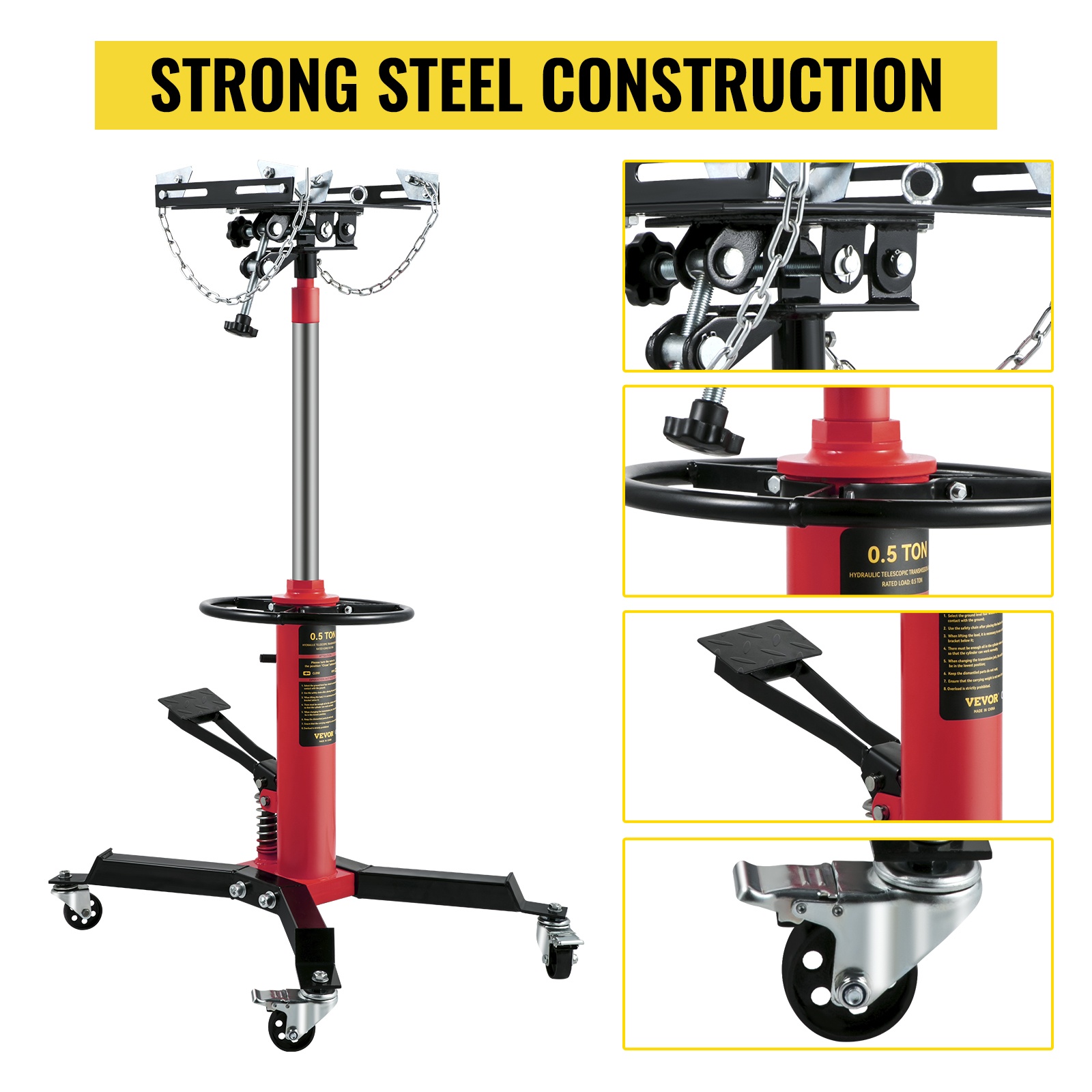 Hydraulinen teleskooppinen vaihteistonostin on suunniteltu henkilö- ja kevyiden hyötyajoneuvojen vaihteistojen asennukseen ja irrotukseen. Säädettävä alusta ja jalkapoljin helpottavat vaihteiston tarkkaa asemointia ja kohdistusta. 4 kääntyvää pyörää ja apurengas helpottavat nostimen siirtämistä ja hallintaa korjaamolla tai autotallissa.