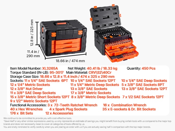 Tämä 450-osainen hylsy- ja työkalusarja on merkitty selkeästi, jotta hylsykokojen tunnistaminen on nopeaa. Se soveltuu sekä kotihuoltoihin että ammattikäyttöön, ja auttaa työskentelemään tehokkaammin ja järjestelmällisemmin.