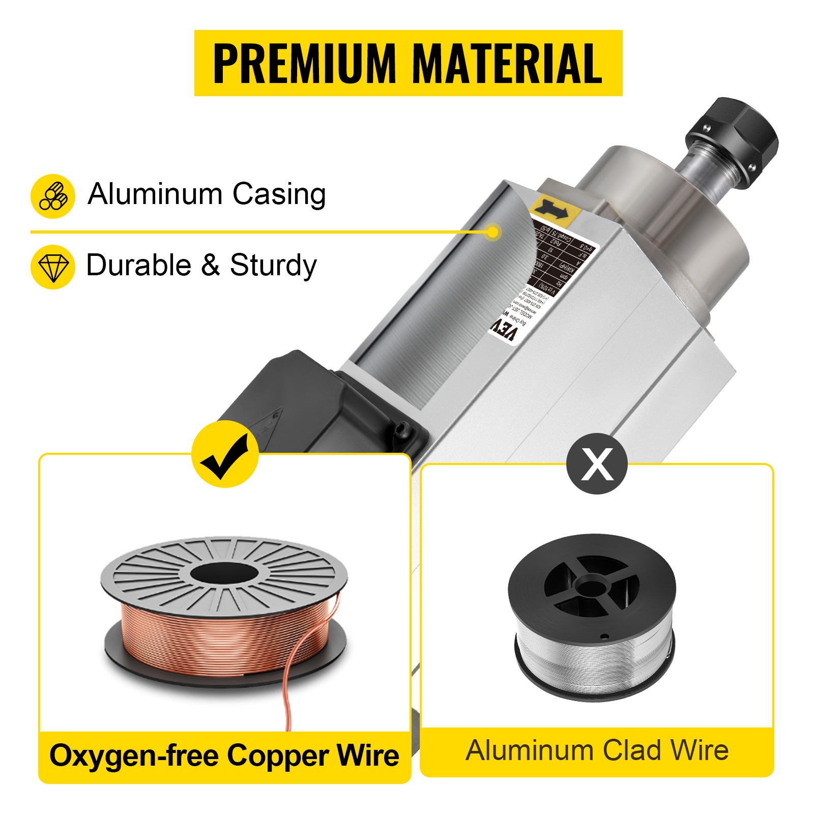 Vahva alumiinirunko tuo lujuutta ja pidentää käyttöikää. Happivapaat kuparikäämit parantavat sähkönjohtavuutta ja tukevat tasaista tehoa tarkassa kaiverrus- ja jyrsintätyössä.