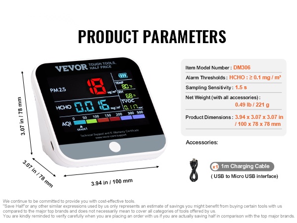 - Toiminto: 9-in-1-ilmanlaadun mittaus (CO2, PM2.5, PM10, PM1.0, HCHO, TVOC, lämpötila, kosteus, AQI)