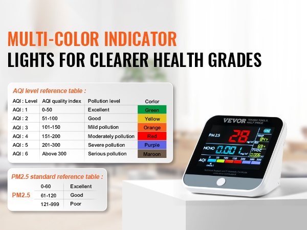 Näytön väri muuttuu ilman saastumistasojen mukaan. Moniväriset ilmaisinvalot auttavat arvioimaan ilmanlaatua nopeasti ilman, että tarvitsee tulkita numerosarjoja.