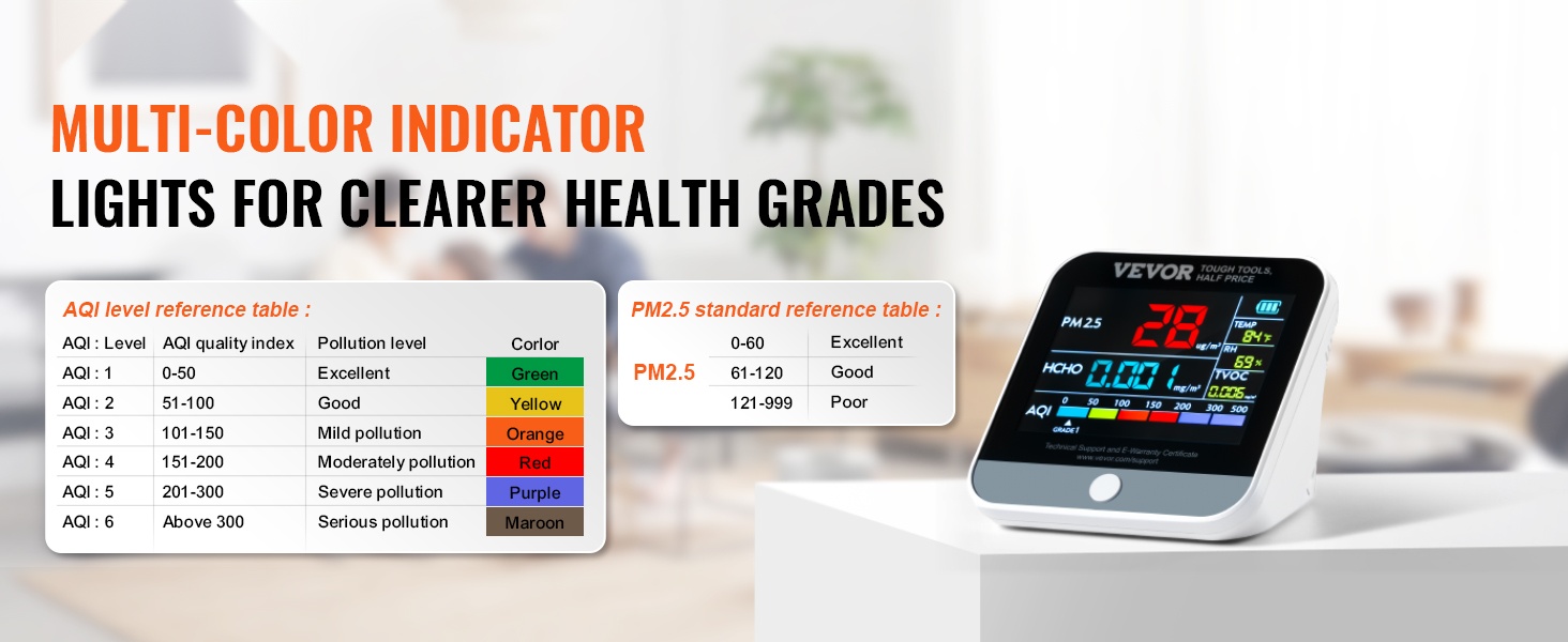 Monitoiminen 9-in-1-ilmanlaadun mittari sisä- ja ulkokäyttöön. Laite seuraa reaaliajassa hiilidioksidia (CO2), lämpötilaa, ilmankosteutta, pienhiukkasia (PM2.5, PM10, PM1.0), formaldehydiä (HCHO), TVOC-yhdisteitä ja laskee ilmanlaatuindeksin (AQI). Suuri värinäyttö ja äänimerkkihälytys helpottavat ilmanlaadun seurantaa kotona, toimistossa tai muissa sisätiloissa.