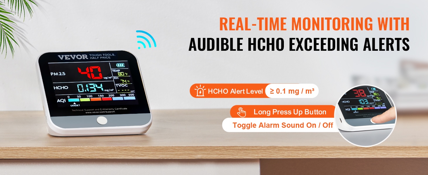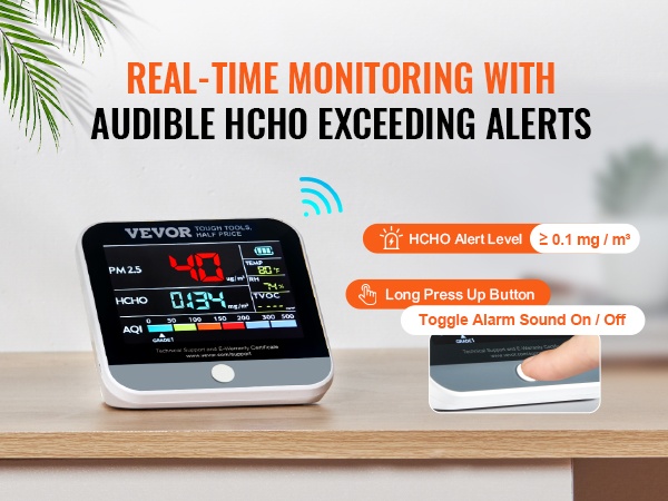 Laite antaa välittömän äänimerkin, kun tietyt raja-arvot ylittyvät, esimerkiksi CO2-pitoisuus saavuttaa 1000PPM. Näin saat reaaliaikaisen ilmoituksen ja voit tarvittaessa tuulettaa tai tehdä muita toimenpiteitä.