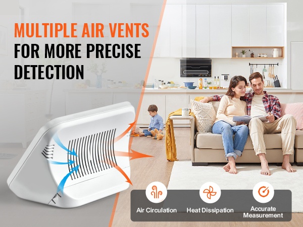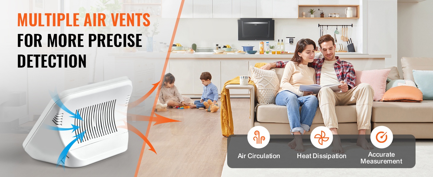 Useat ilmanottoaukot parantavat ilman kiertoa laitteen läpi ja tukevat tarkempaa mittaustulosta. Runko on valmistettu kestävästä ABS-muovista pitkäaikaista käyttöä varten.