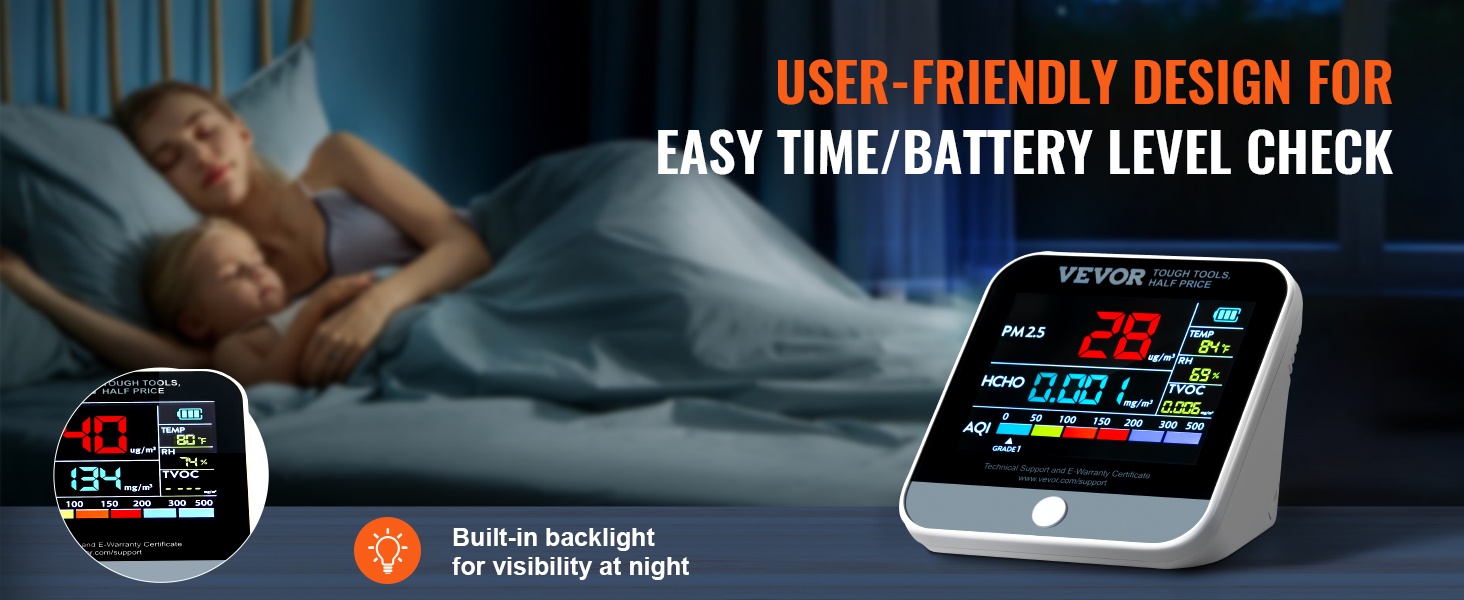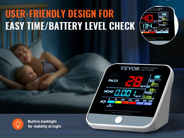- 9-in-1-ilmanlaadun seuranta: CO2, PM2.5, PM10, PM1.0, HCHO, TVOC, lämpötila, kosteus ja AQI