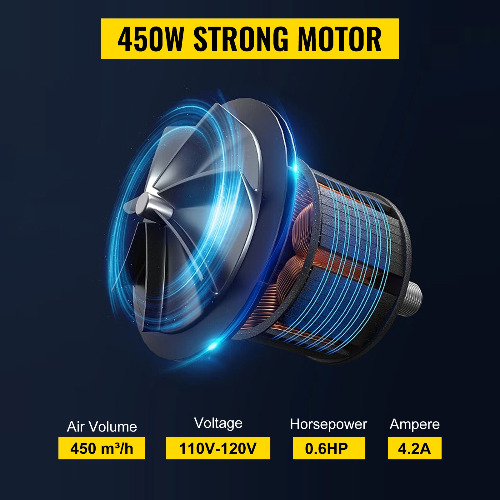 Teho: 0.6HP. Korkealaatuinen 450W moottori tuottaa vahvan ilmavirran puhallettavien tuotteiden täyttöön. Pyörimisnopeus on 3400 r/min ja ilmamäärä 450 m³/h, mikä takaa nopean täytön ja jatkuvan ilmanvaihdon energiankulutusta hilliten.