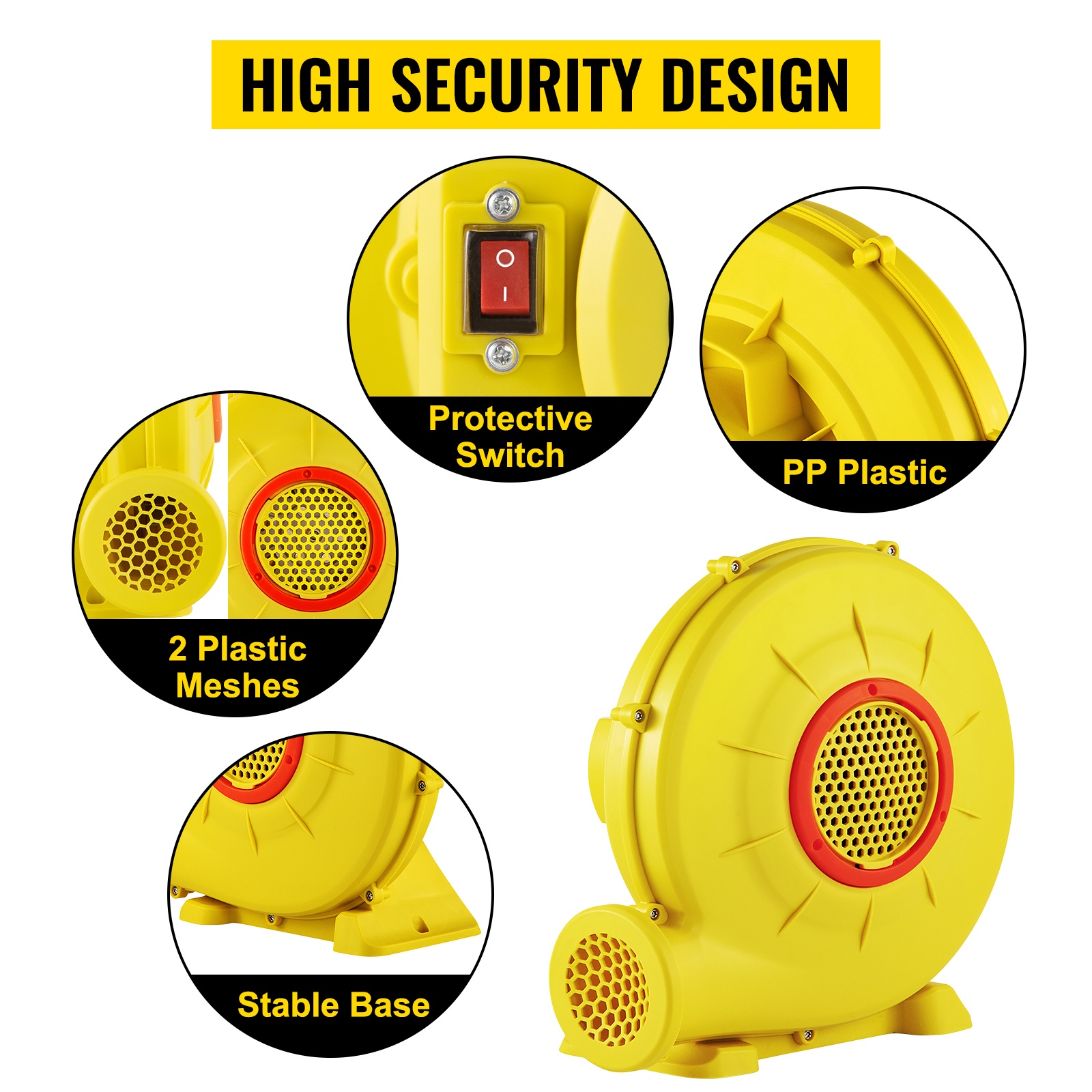 Puhallin on valmistettu laadukkaasta PP-muovista, joka on paloa hidastava ja kestää staattista sähköä. Kahdessa ilmanpoistoaukossa on suojaverkot, jotka ehkäisevät vammoja. Lisäksi läpinäkyvällä kalvolla suojattu kytkin parantaa turvallisuutta käytön aikana.