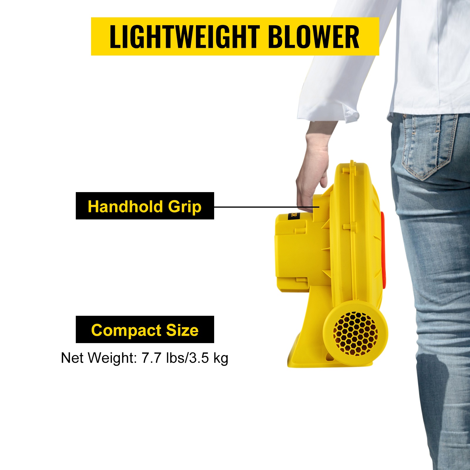 Tämä 450W ilmapuhallin on suunniteltu erilaisten puhallettavien tuotteiden, kuten pomppulinnojen, vesiliukumäkien, esteratojen ja puhallettavien sohvien nopeaan ja tasaiseen täyttöön. Kestävä, paloa hidastava PP-muovi ja suojattu kytkin lisäävät turvallisuutta, ja kompakti koko tekee laitteen siirtämisestä ja säilyttämisestä helppoa. Ilmamäärä on 450 m³/h ja pyörimisnopeus 3400 r/min, joten puhallin tuottaa jatkuvan ilmavirran tehokkaasti ja energiatehokkaasti.