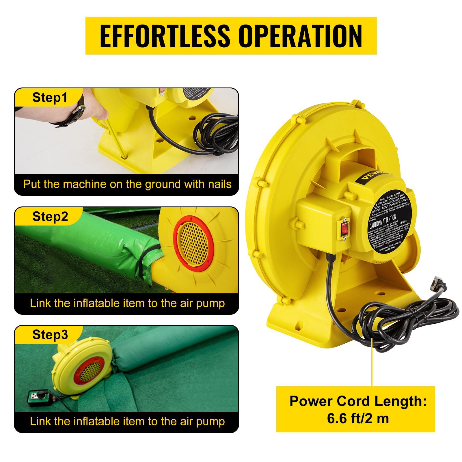 Puhallin on nopea ottaa käyttöön: aseta laite maahan ja kiinnitä se mukana tulevilla nauloilla, liitä puhallettava tuote ulostuloaukkoon, kytke virta ja paina kytkimestä. Virtajohdon pituus on 6.6 jalkaa / 2 m, mikä antaa hieman liikkumavaraa sijoitteluun.