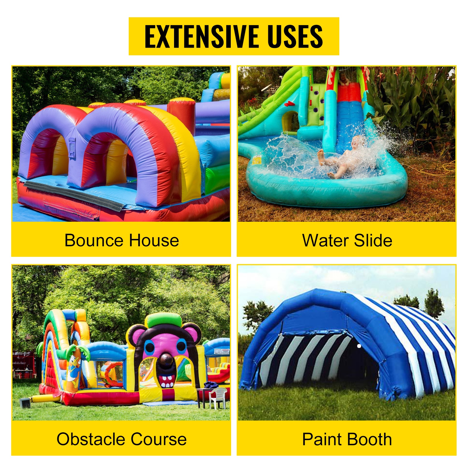 Ulostuloaukon halkaisija: 4.1 tuumaa / 10.5 cm. Sopii moniin puhallettaviin rakenteisiin, kuten pomppulinnoihin, vesiliukumäkiin, esteratoihin, puhallettaviin maalauskopeihin ja puhallettaviin sohviin, sekä sisä- että ulkokäytössä.