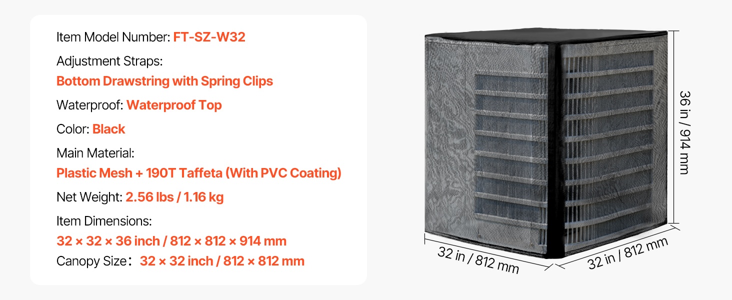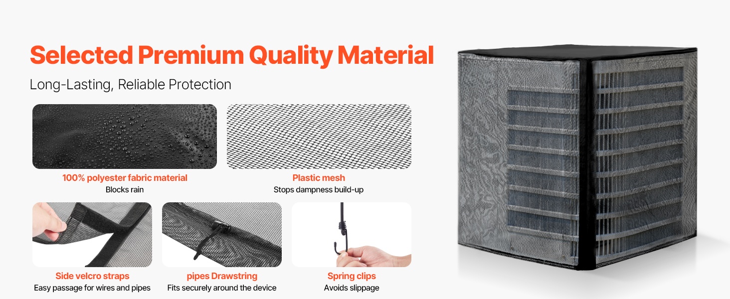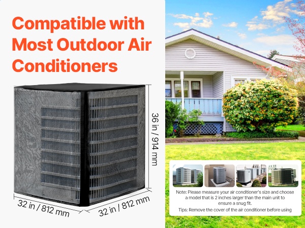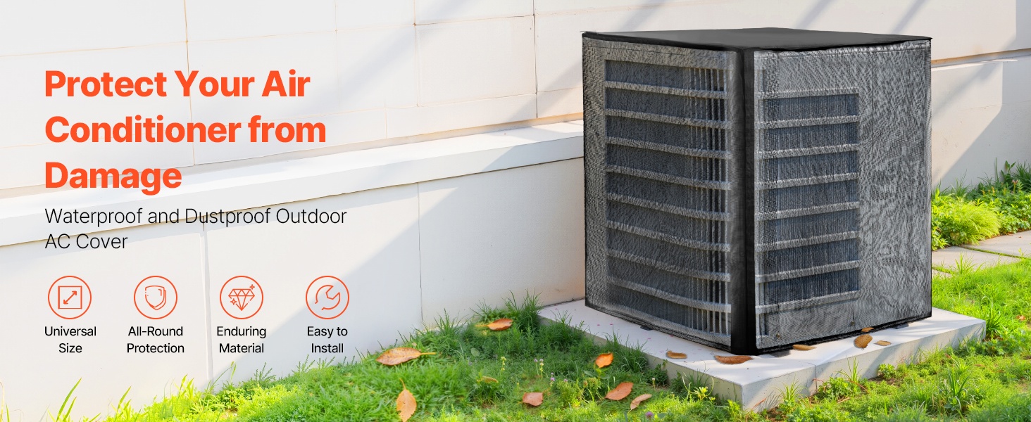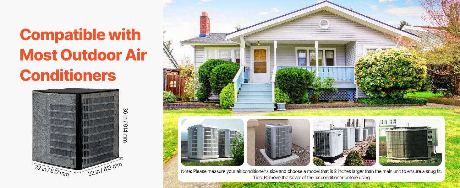 Yleismallinen rakenne sopii moniin erilaisiin ulkoisiin ilmastointiyksiköihin. Hyvän istuvuuden varmistamiseksi suositellaan valitsemaan malli, joka on noin 2 tuumaa alkuperäistä ulkoyksikköä suurempi. Mittaa yksikkö huolellisesti ennen hankintaa, jotta vältyt asennusongelmilta.