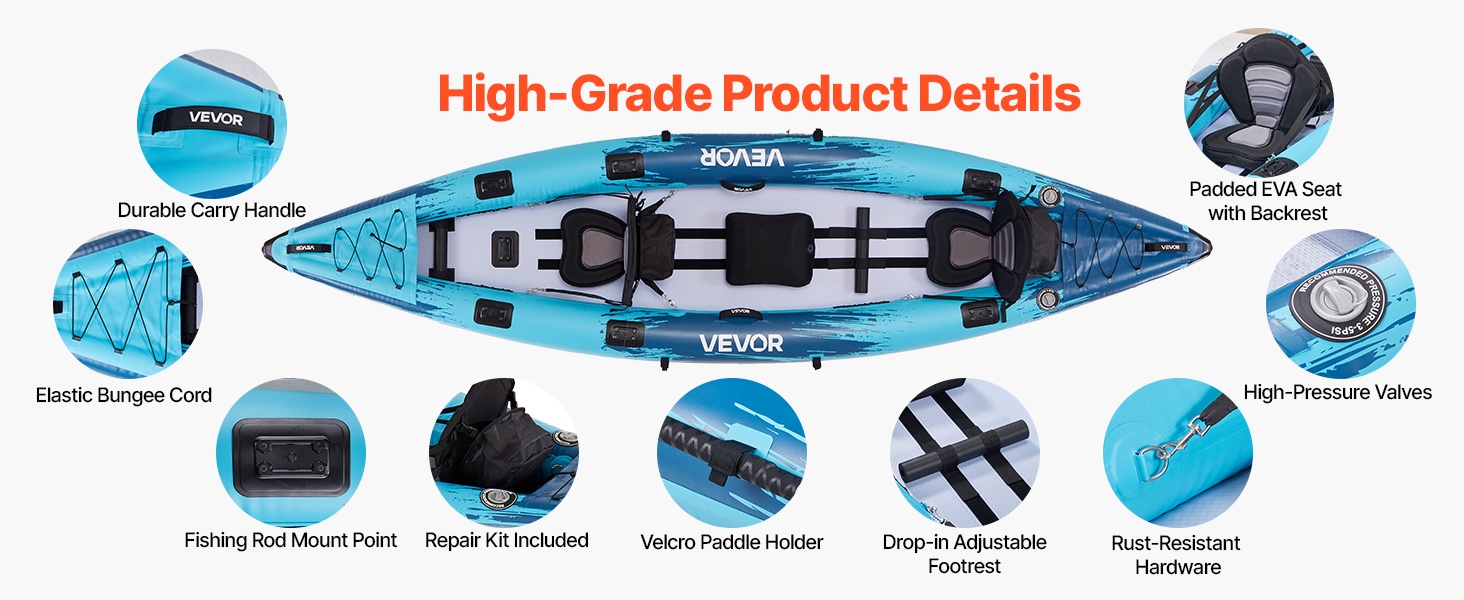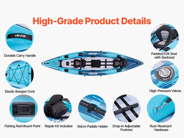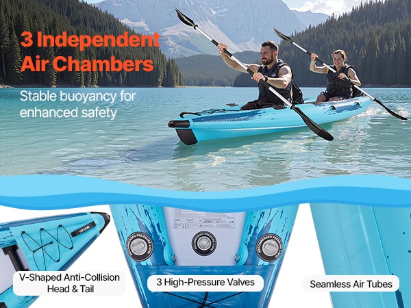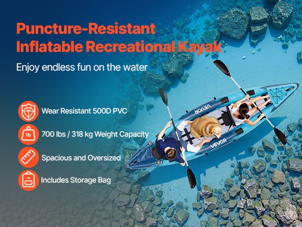 Tämä kahden hengen ilmatäytteinen kajakki tarjoaa korkean kantavuuden, tukevan rakenteen ja miellyttävän istuma-asennon rauhallisille retkille, kalastusreissuille ja leirintäkäyttöön. Paksu, puhkaisua kestävä PVC-materiaali ja jäykkä drop-stitch -pohja tekevät melonnasta vakaata ja miellyttävää.