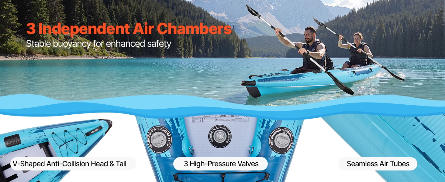 3 erillistä ilmakammiota tarjoavat vakaan kelluvuuden ja lisäturvaa. Saumattomat ilmaputket yhdistettynä vahvistettuun, törmäyksiä vaimentavaan keulaan ja perään parantavat ilmatiiveyttä ja iskunkestävyyttä.