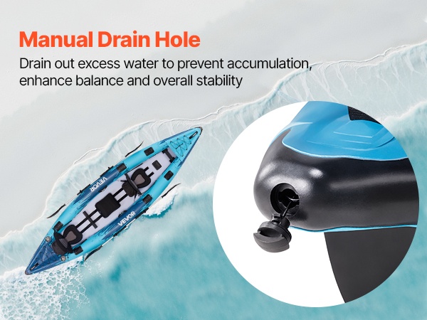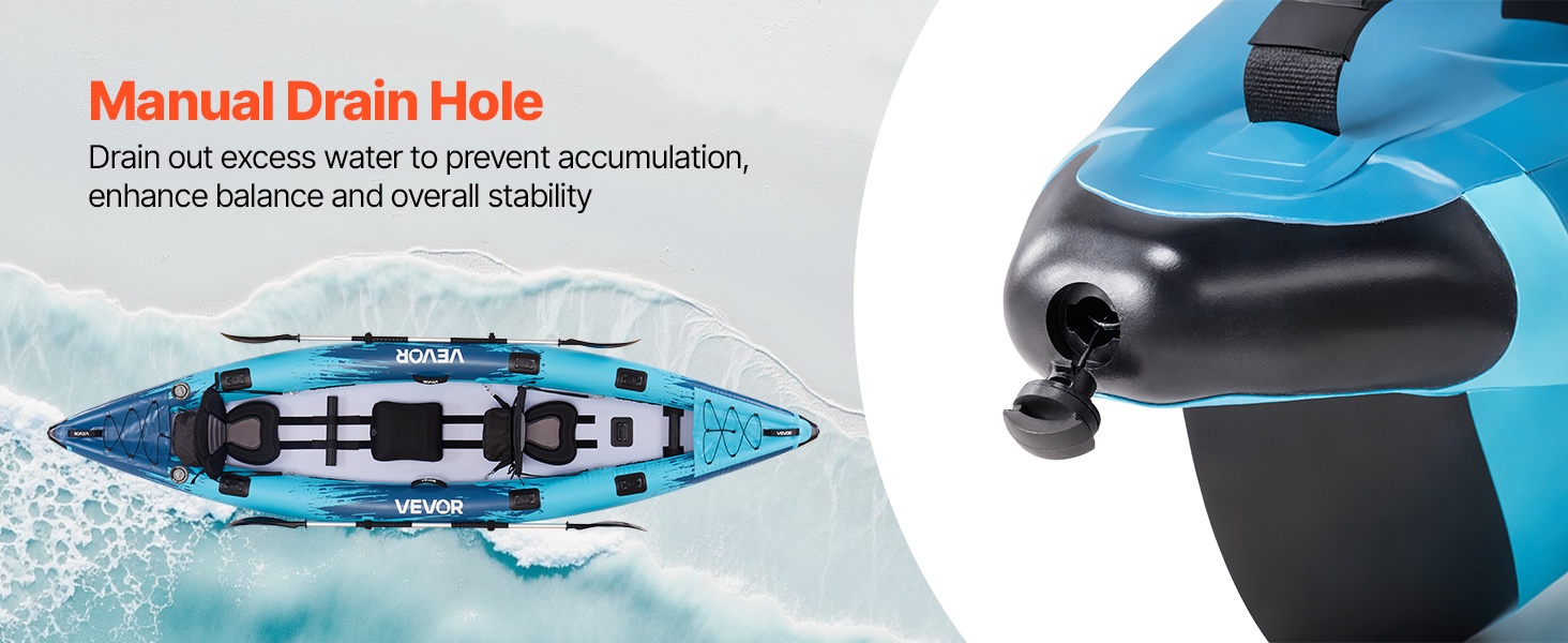 Manuaaliset tyhjennysaukot poistavat tehokkaasti ylimääräistä vettä kajakin sisältä. Näin vältetään veden kertymisestä johtuvat tasapaino-ongelmat ja parannetaan kokonaisvakautta, mikä tekee melonnasta turvallisempaa ja sujuvampaa.