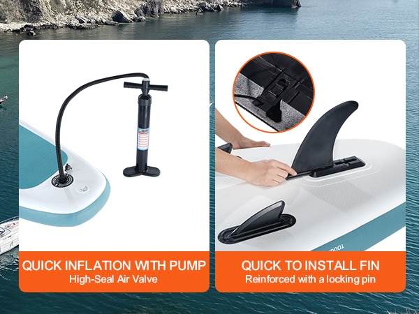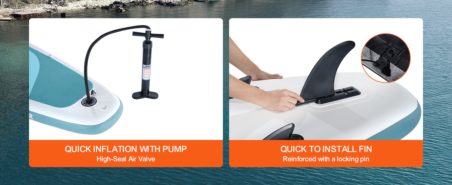 Toimitukseen sisältyvä käsipumppu mahdollistaa laudan nopean täyttämisen. Tiivis venttiili pitää ilman paineen tasaisena käytön aikana. Suositeltu käyttöpainemalue on 12–15 psi, ja painemittarista voit helposti tarkistaa oikean paineen.