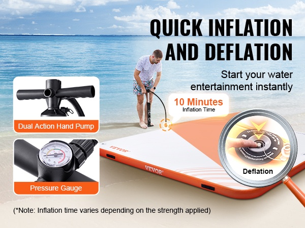 Kaksoistoiminen käsipumppu helpottaa sekä täyttämistä että tyhjentämistä. Mukana oleva painemittari auttaa seuraamaan ilmanpainetta, jotta laiturin voi täyttää sopivan kovaksi miellyttävää ja turvallista käyttöä varten.