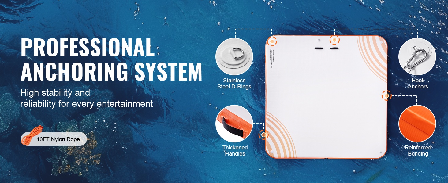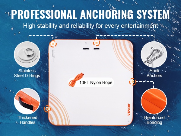 Ammattimainen ankkurointijärjestelmä pitää lautan paikoillaan. Laiturissa on 6 ruostumattomasta teräksestä valmistettua D-rengasta, 6 vahvistettua kantokahvaa, 4 koukkuankkuria ja 10 ft nailonköysi, joiden avulla alusta voidaan kiinnittää tukevasti veteen.