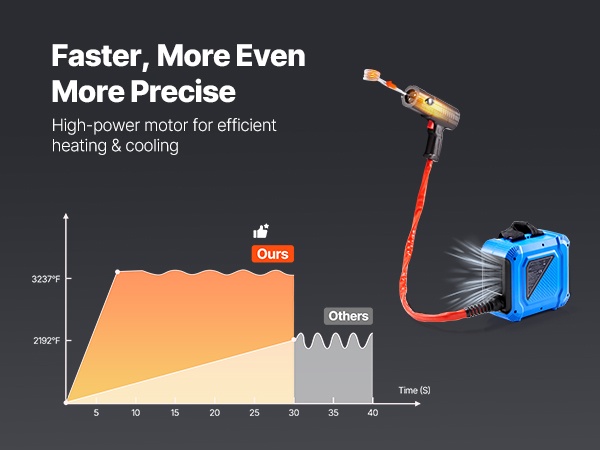 Laitteessa ei tarvita avotulta, mikä vähentää perinteisiin lämmitysmenetelmiin liittyviä riskejä ja pienentää vaikutusta lähellä oleviin osiin. Vesijäähdytystä ei tarvita, ja käyttö ei edellytä ammattimaista pätevyyttä.