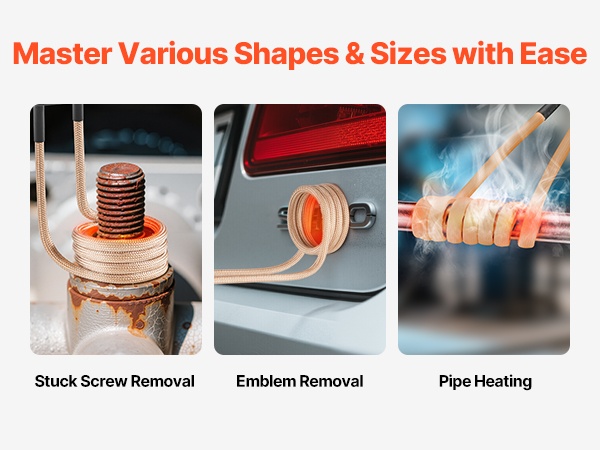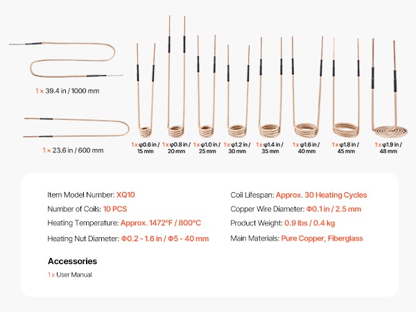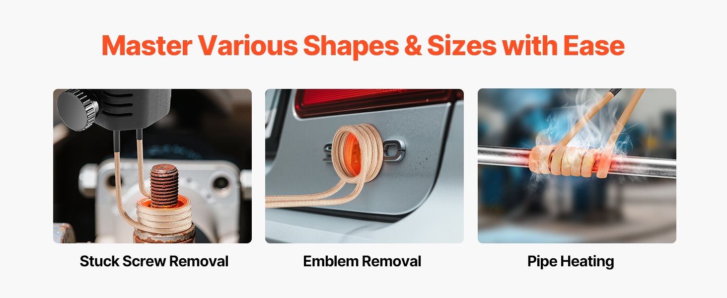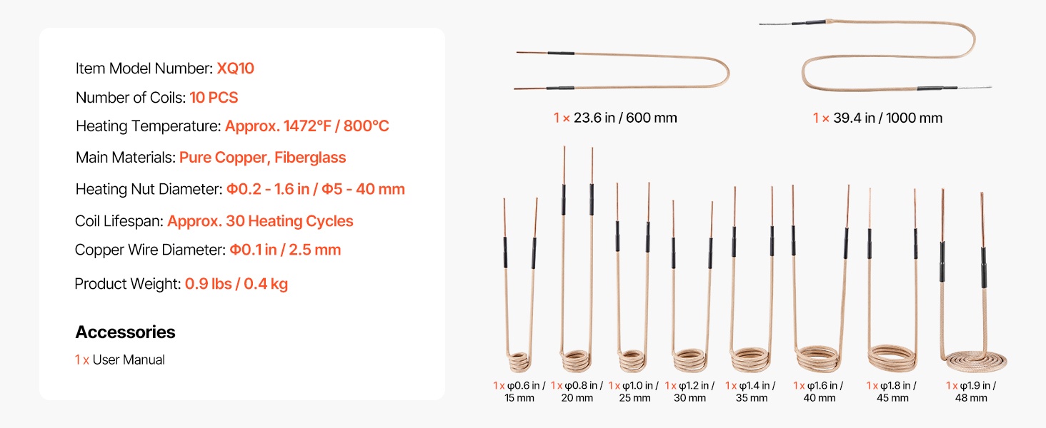 Tämä lämmityskelapaketti sopii useimpiin yleisiin induktiolämmittimen päihin. Eri kokoiset kelat käsittelevät erikokoisia pultteja ja epäsäännöllisiä työkappaleita. Sekä pienet ruuvit että suuremmat laakerit voidaan lämmittää tarkasti juuri oikeasta kohdasta.