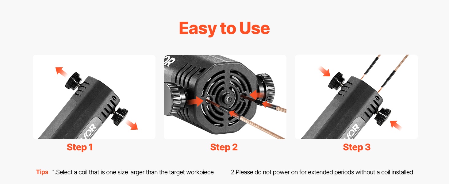 Kelan vaihtaminen on yksinkertaista: löysää vain kaksi yläreunan sivumutteria ja vaihda kela. Induktiolämmityksen lisävarusteet lukittuvat tukevasti eivätkä löysty helposti. Valitse aina kohdepulttia yhtä kokoa suurempi kela, jotta lämmitys on tehokasta ja turvallista.
