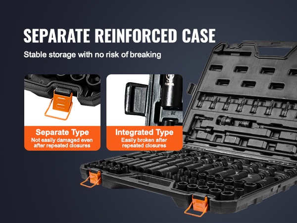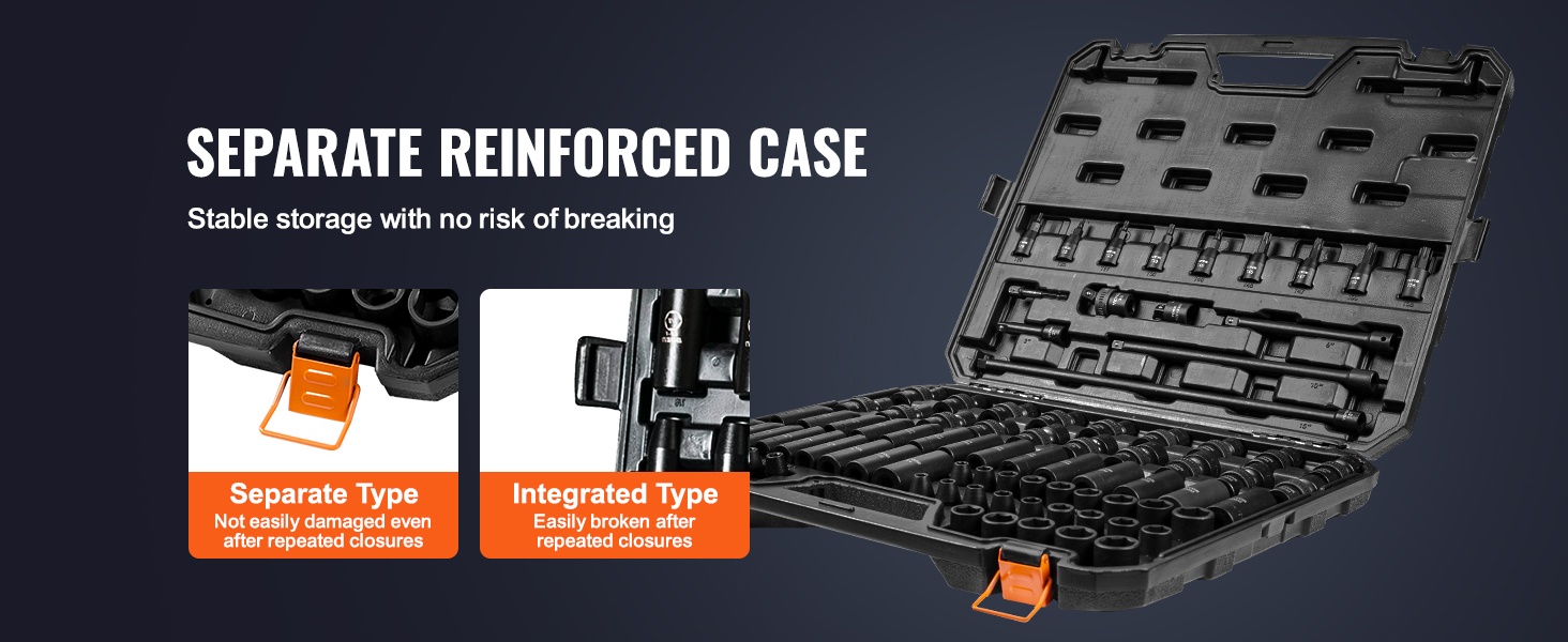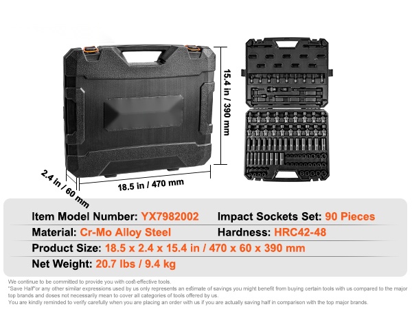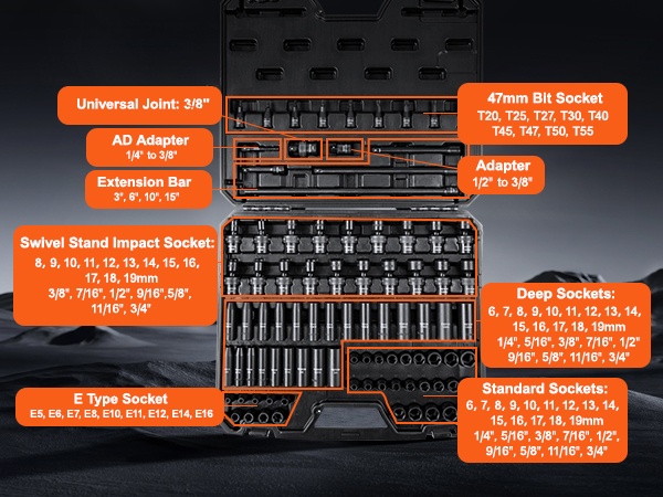Tämä 90-osainen 3/8" iskuhylsysarja kattaa sekä SAE- että metrikoot ja soveltuu autonhuoltoon, laiteasennuksiin ja moniin muihin korjaus- ja ylläpitötöihin. Sarja on valmistettu Cr-Mo-teollisuusluokan seosteräksestä, joka on lämpökäsitelty (karkaisu korkeassa lämpötilassa ja taonta matalassa lämpötilassa), mikä antaa kovuuden HRC42-48.