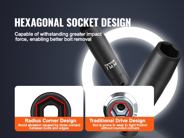 Hylsyjen kuusikulmainen muotoilu luo pienen raon mutterin ja reunojen väliin käytön aikana. Tämä vähentää liiallista kitkaa ja kulumista, kestää suurempia iskukuormia ja auttaa irrottamaan pultit tehokkaasti.