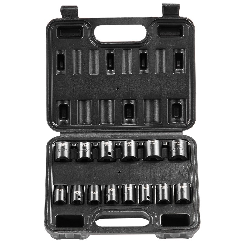 3/8-tuuman 14-osainen iskuhylsysarja tarjoaa kattavan valikoiman matalia hylsyjä ajoneuvojen huoltoon ja muuhun korjaustyöhön. Sarja sopii erinomaisesti erilaisiin muttereihin ja pultteihin ja kulkee kätevästi mukana tukevassa säilytyslaatikossa.