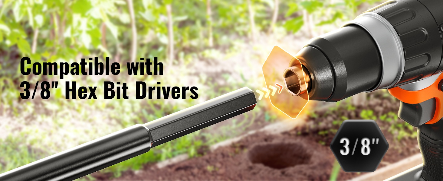 Puutarhakairan asennus on yksinkertaista: aseta kaira 3/8" kuusiokoloistukalla varustettuun porakoneeseen ja kiristä paikalleen. Kaira pyörii tasaisesti ilman voimakasta tärinää, jolloin kuopat syntyvät nopeasti ja siististi.