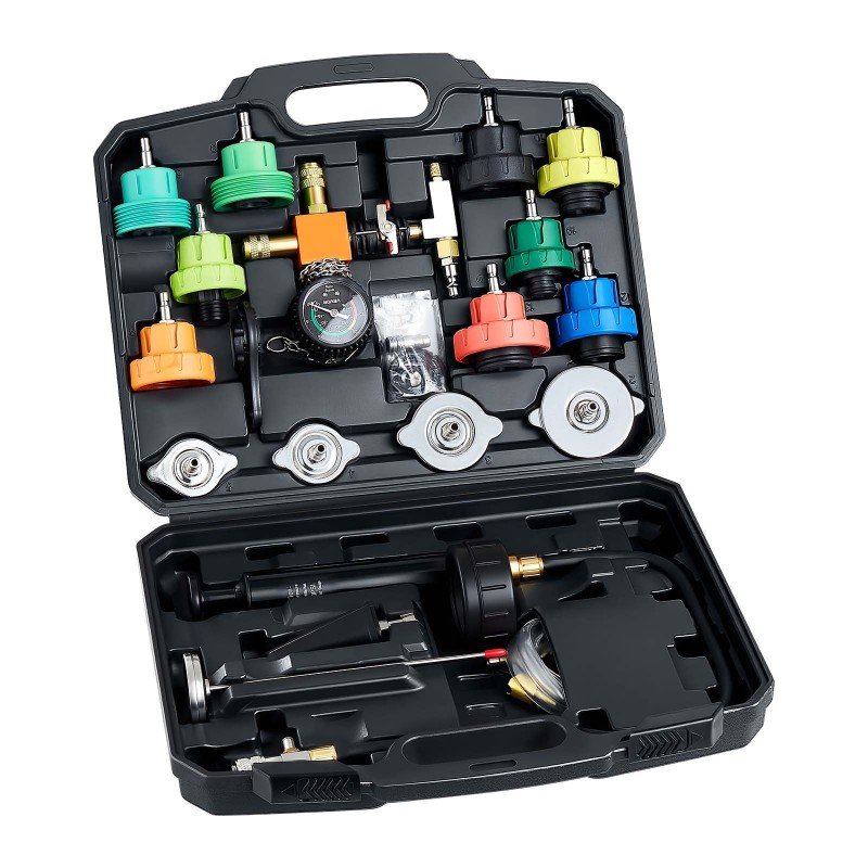 28-osainen jäähdytysnesteen paine- ja tyhjiötestisarja, mittaa lämpötilan ja täyttää nesteen paineilmakompressorilla. Kestävä alumiinipumppu, tärinänkestävä mittari, messinkipikaliittimet, useat adapterit ja säilytyskotelo. Sopii useisiin ajoneuvoihin.