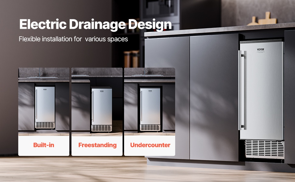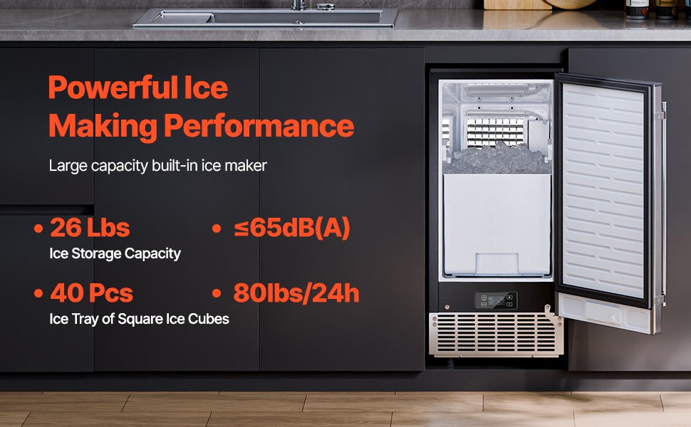 Tämä tehokas kalusteisiin integroitava jääpalakone tuottaa jopa 80 lbs jääkuutioita (0.87 x 0.87 x 0.87 tuumaa / 22 x 22 x 22 mm) vuorokaudessa, ja ensimmäiset jääpalat valmistuvat noin 15 minuutissa. Jääkorin kapasiteetti on 26 lbs / 12 kg, joten käytössäsi on tasainen jäätarjonta keittiöön, kotiin tai ammattikäyttöön.