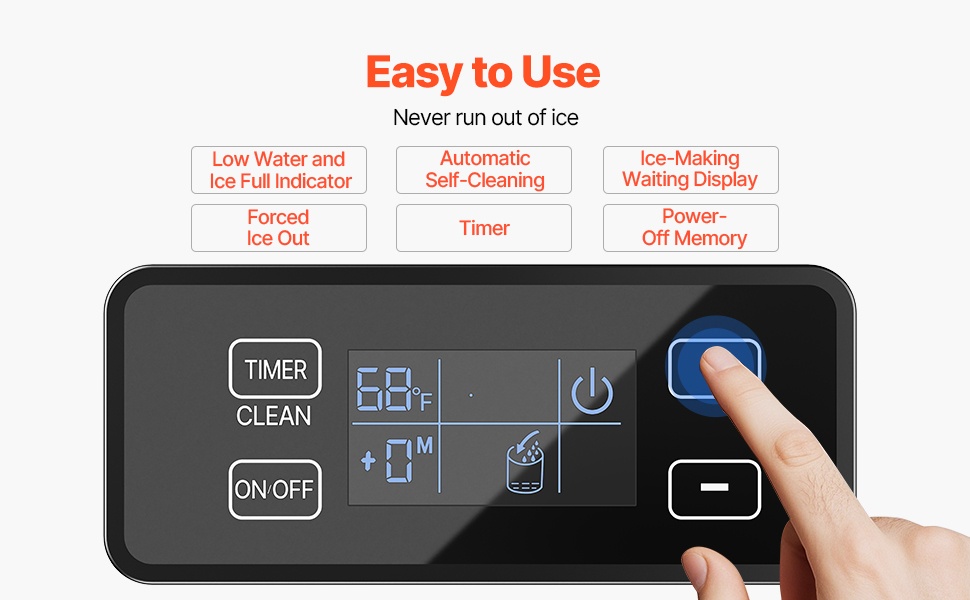 Laite ilmoittaa, kun veden määrä on vähissä tai jääkori on täynnä. Pakkotoiminen jäänpoisto helpottaa jään ottamista käyttöön. Automaattinen itsepuhdistustoiminto helpottaa huoltoa, ja ajastin, jäänvalmistuksen odotustilan näyttö sekä virrankatkaisumuisti tekevät käytöstä sujuvaa arjessa.