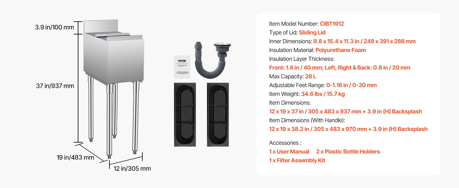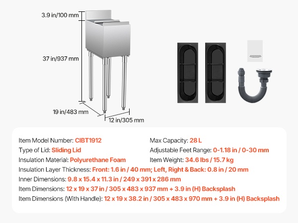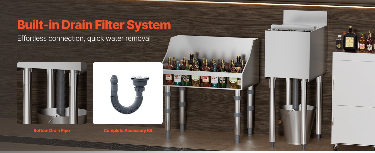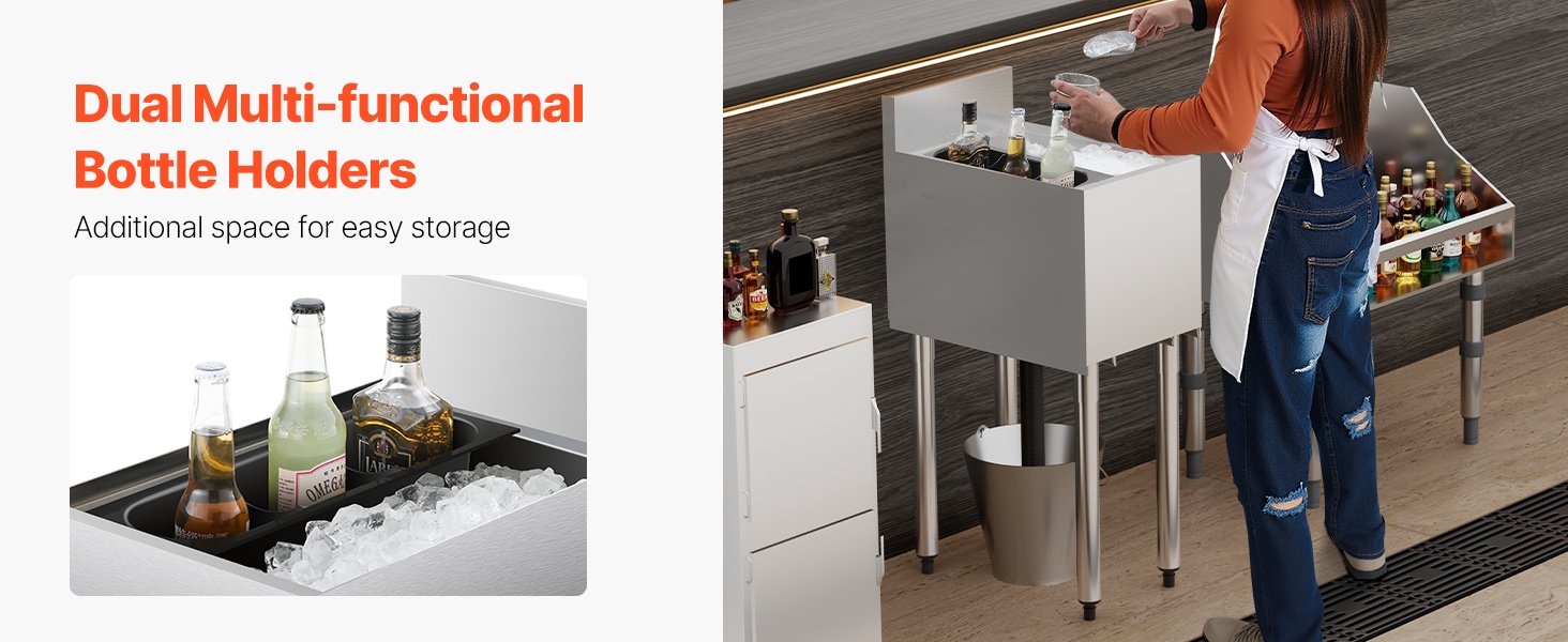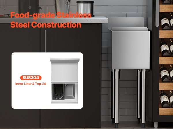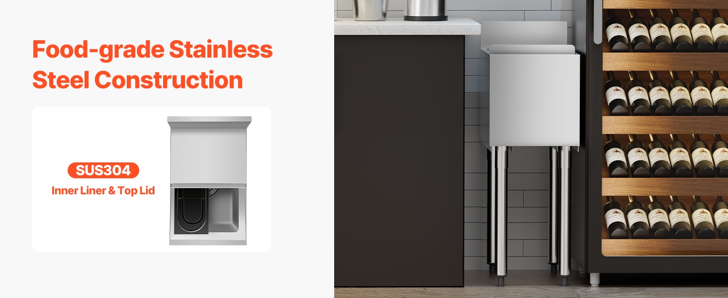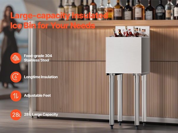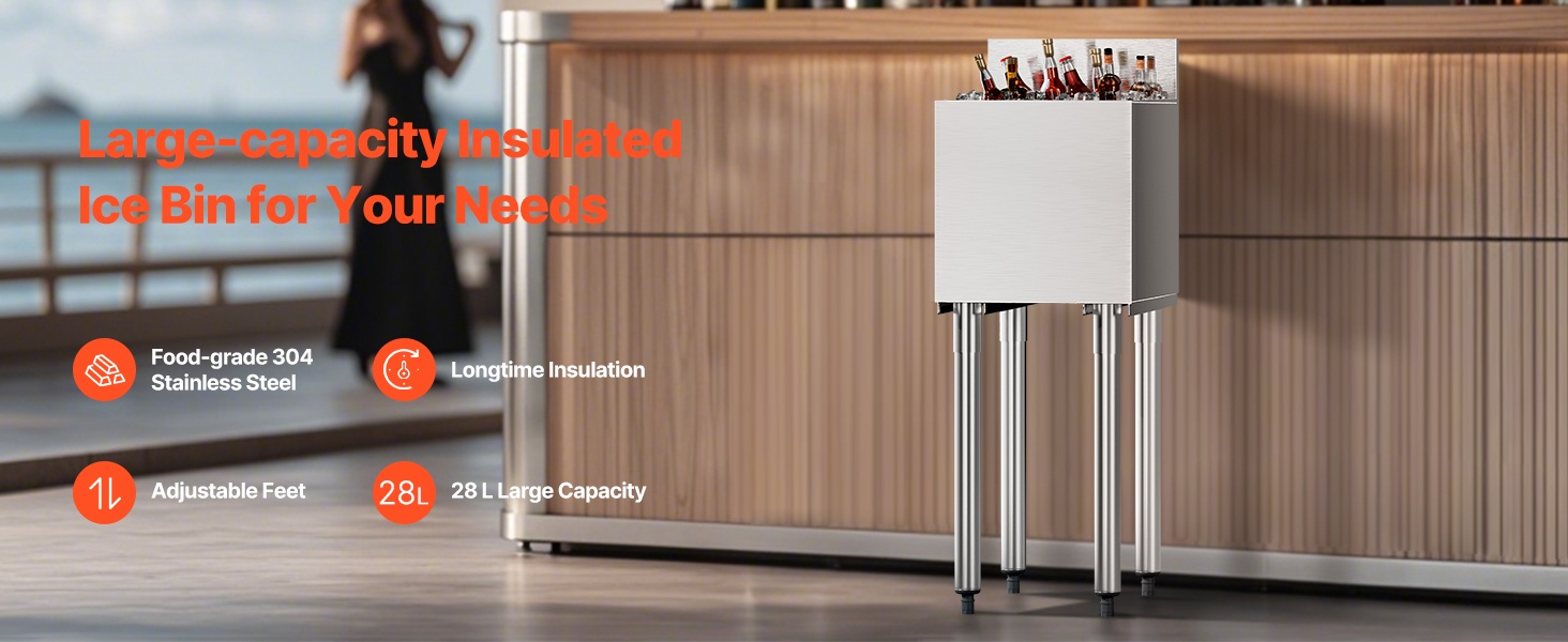61.6 L:n kapasiteetin kaupallinen jääsäiliö yhdistää tehokkaan eristyksen ja käytännöllisen rakenteen. 304-elintarvikelaatuisesta ruostumattomasta teräksestä valmistettu säiliö pitää jään kylmänä jopa 24 tuntia ja soveltuu hyvin ammattikäyttöön baareissa, ravintoloissa, keittiöissä ja pubeissa.