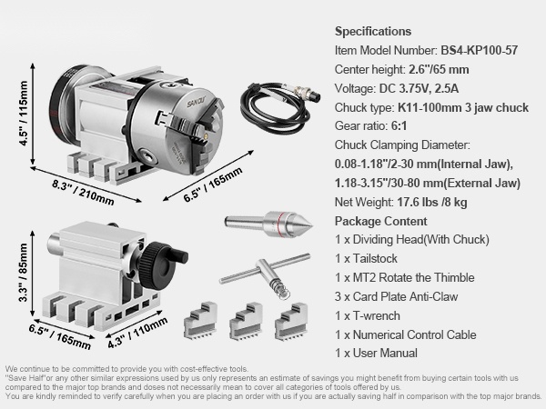 Tämä jako-osa tarjoaa CNC Rotational Axis 4th Axis -kiertoakselin, 6:1 välityssuhteen ja Nema23 2-vaiheisen askelmoottorin, mikä mahdollistaa tarkan ja toistettavan indeksoinnin laajalla kulmavalikoimalla. K11-100MM 3-leukapakka lisää työtehokkuutta ja helpottaa monimutkaisten muotojen työstöä.