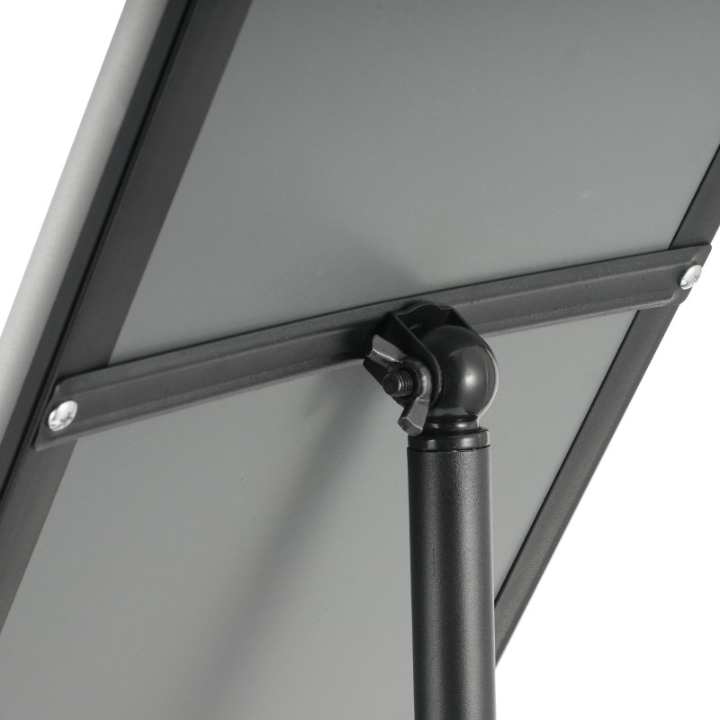 Kylttitelineen korkeutta voidaan säätää välillä 32.3" – 49.2" / 820 – 1250 mm. Näin teline sopii sekä lattialla seisovaksi opasteeksi että pöydälle asetettavaksi telineeksi. Lukitusmekanismi pitää korkeussäädön tukevasti paikoillaan ja estää löystymisen tai tahattoman putoamisen.