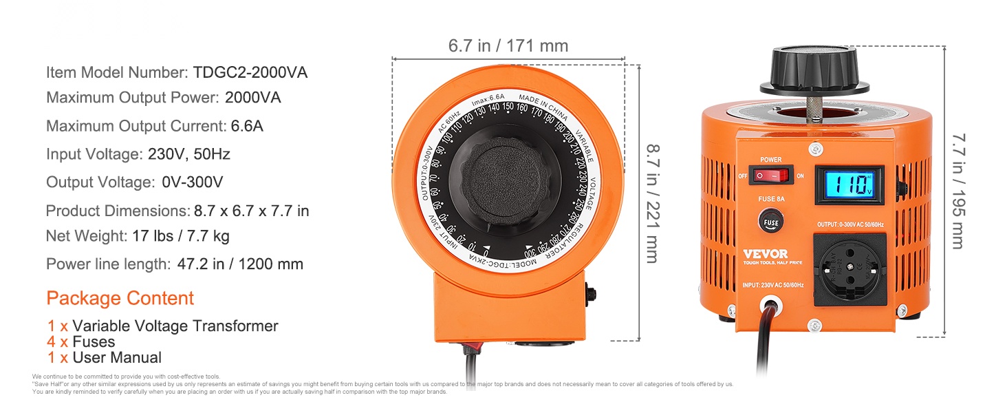 Kompakti 500VA säädettävä jännitemuuntaja, jossa on 0–300V säätöalue, lämpötilasuoja, ylikuormitussuojakytkin ja mukana tulevat varasulakkeet. Soveltuu kotikäyttöön, toimistoon ja teollisiin sovelluksiin, kun laitteet tarvitsevat tarkkaa ja vakaata vaihtojännitettä.