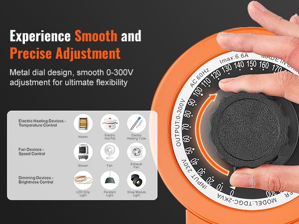 Päällä oleva säätönuppi mahdollistaa portaattoman jännitteensäätelyn välillä 0–300V. Voit asettaa tarkasti juuri sen jännitteen, jota laitteesi tai testausympäristösi tarvitsee.