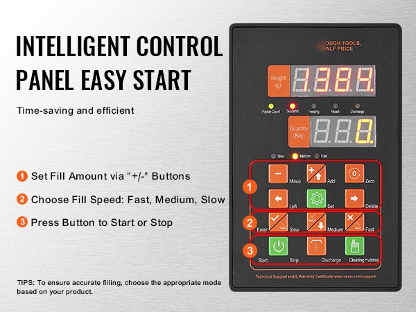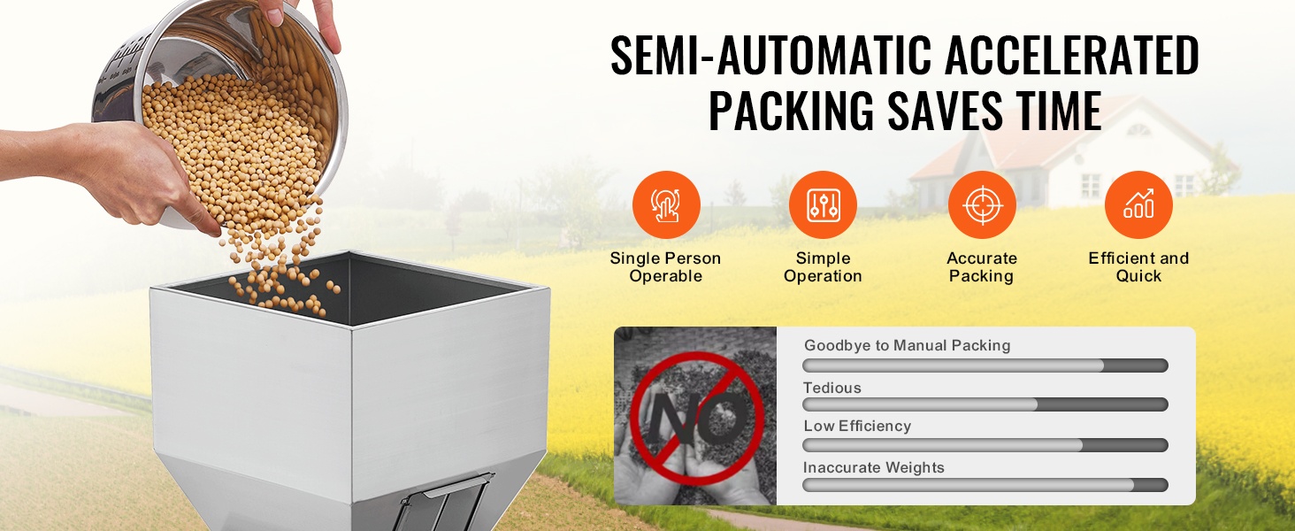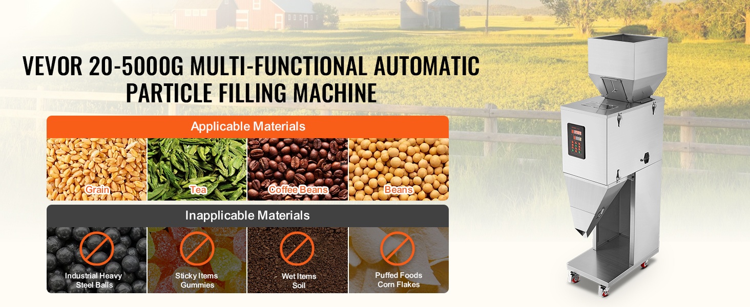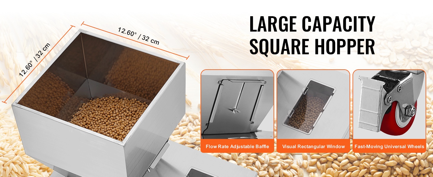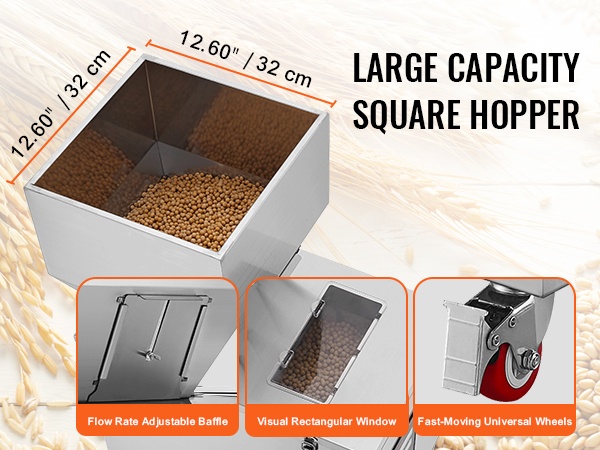 Rakeentäyttökoneessa on läpinäkyvä ikkuna yläosassa, joten voit seurata toimintaa ja huomata mahdolliset tukokset ajoissa. 304-ruostumattomasta teräksestä valmistettu säiliö takaa elintarviketurvallisuuden ja tarjoaa riittävän kapasiteetin. Säädettävien säätölevyjen avulla ohjaat materiaalin virtausnopeutta helposti.