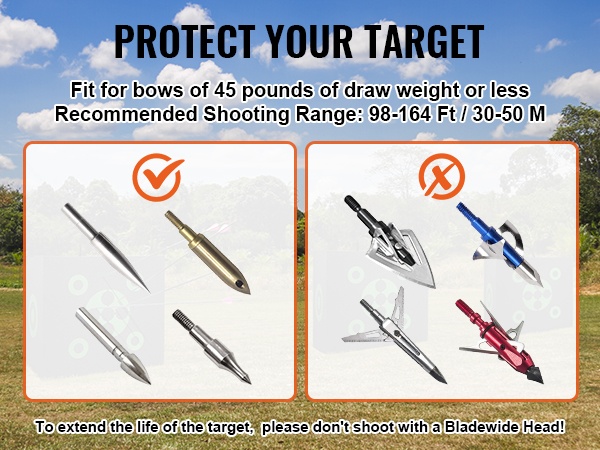 Tausta on suunniteltu käytettäväksi enintään 45 paunan vetopainolla varustettujen jousien kanssa. Suositeltu ampumaetäisyys on 98–164 jalkaa. Kestävyyden säilyttämiseksi ei suositella leveäkärkisten metsästyskärkien käyttöä.