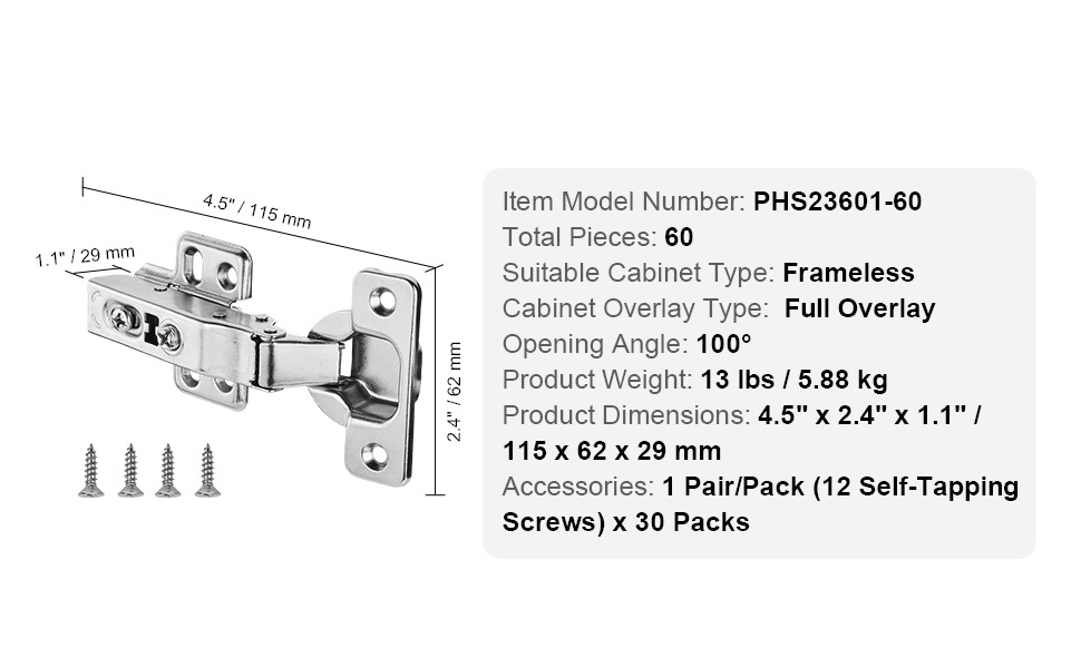 Yksi saranapari kestää jopa 7.7 lb (paunaa) oven painoa, joten myös raskaammat kaapinovet pysyvät tukevasti paikallaan ja käytössä luotettavina.