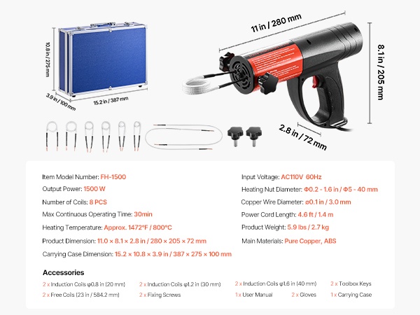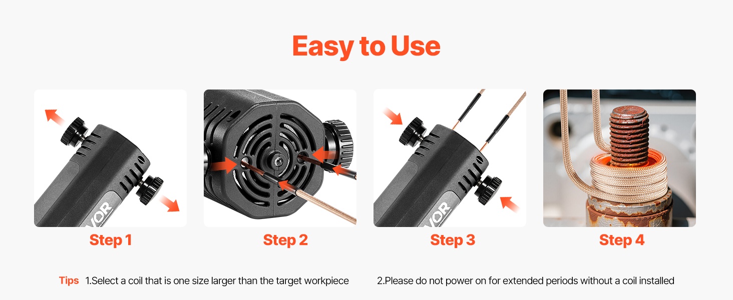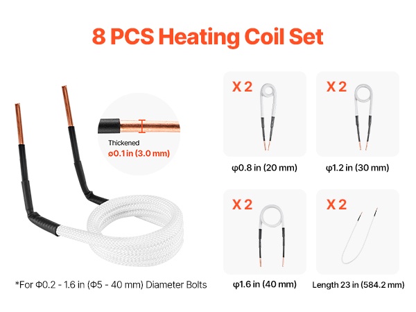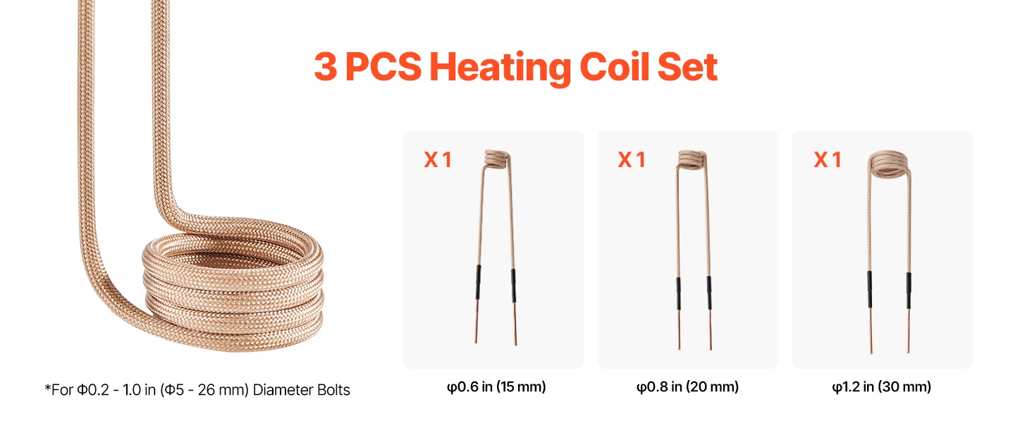 - 3 erikokoista käämiä: sopivat sekä pienille ruuveille että suuremmille laakereille ja muttereille (lämmitysalue noin 0.2–1 in / 5–26 mm)