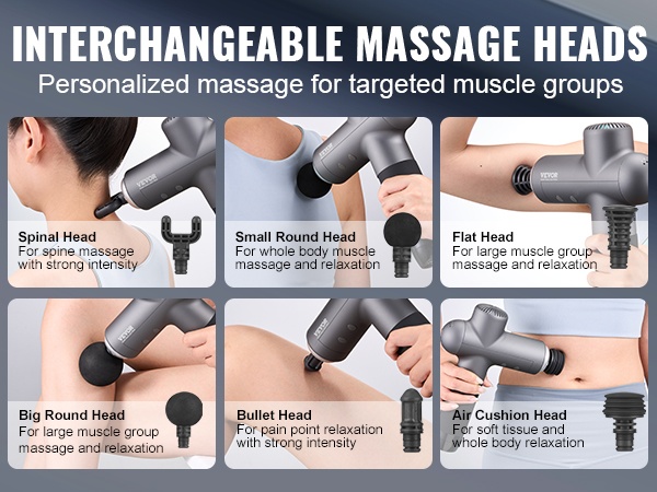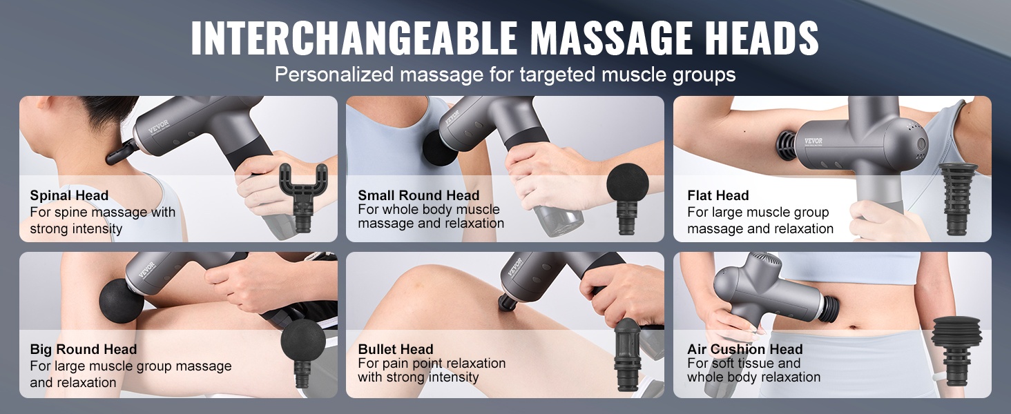 Pakkaukseen sisältyy 6 erilaista hierontapäätä, joilla voit mukauttaa hieronnan eri lihasryhmille ja tilanteisiin. Voit valita syväkudoshierontaan sopivan pään tai kevyempään pintalihasten rentoutukseen soveltuvan vaihtoehdon.