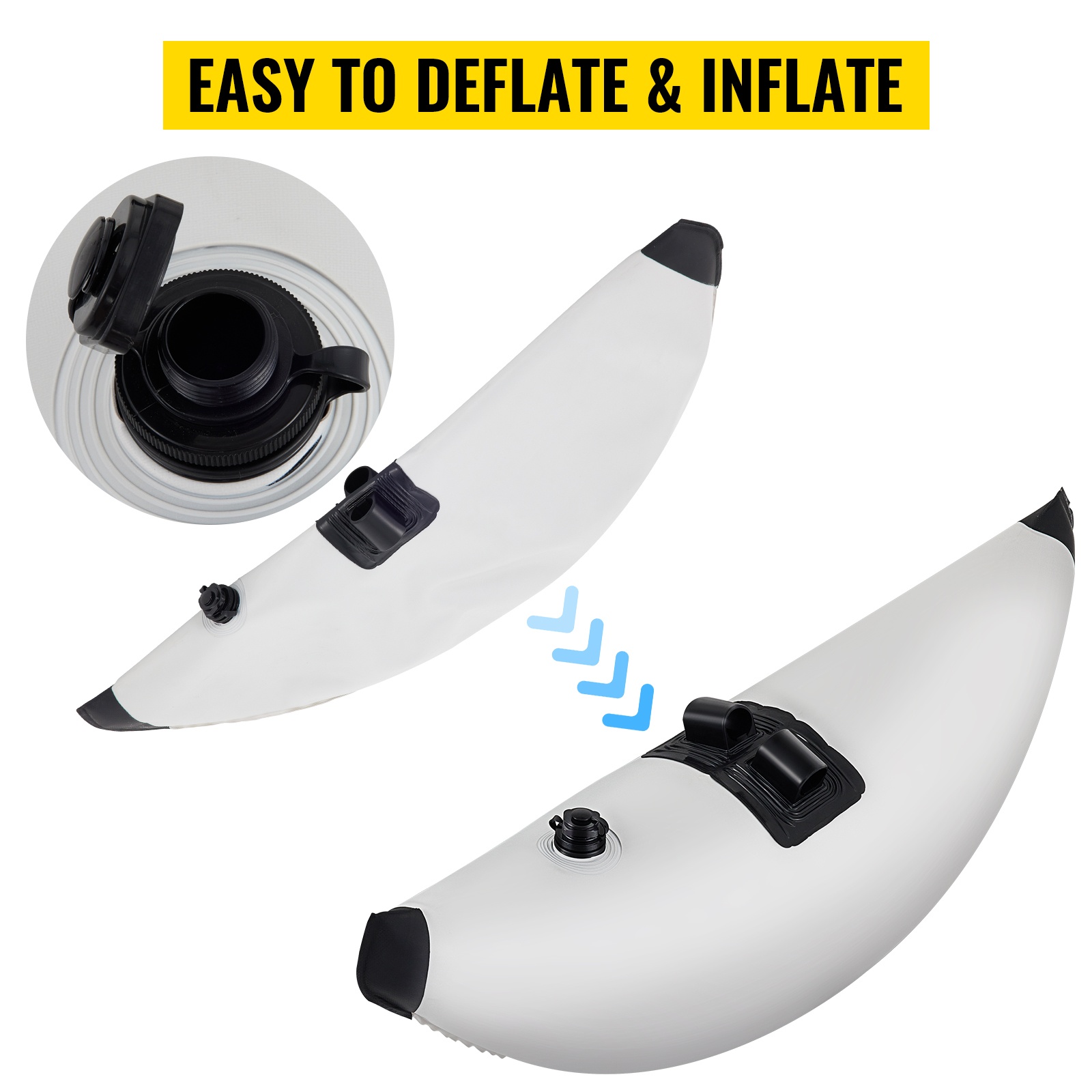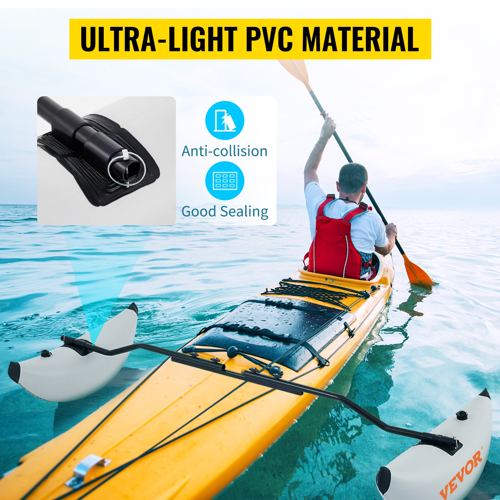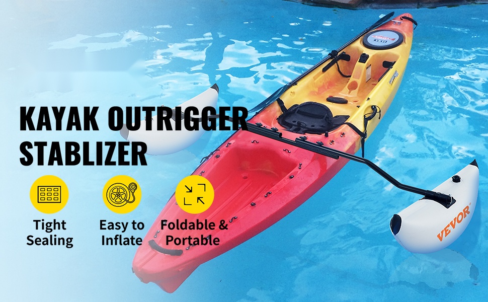 Ilmalla täytettävät PVC-sivukellukkeet ja säädettävä yhdystanko lisäävät kajakin, kanoottien ja pienten veneiden vakautta. Kevyt, helppo asentaa, seisomiseen ja kalastukseen, kompakti säilytys rullattuna.