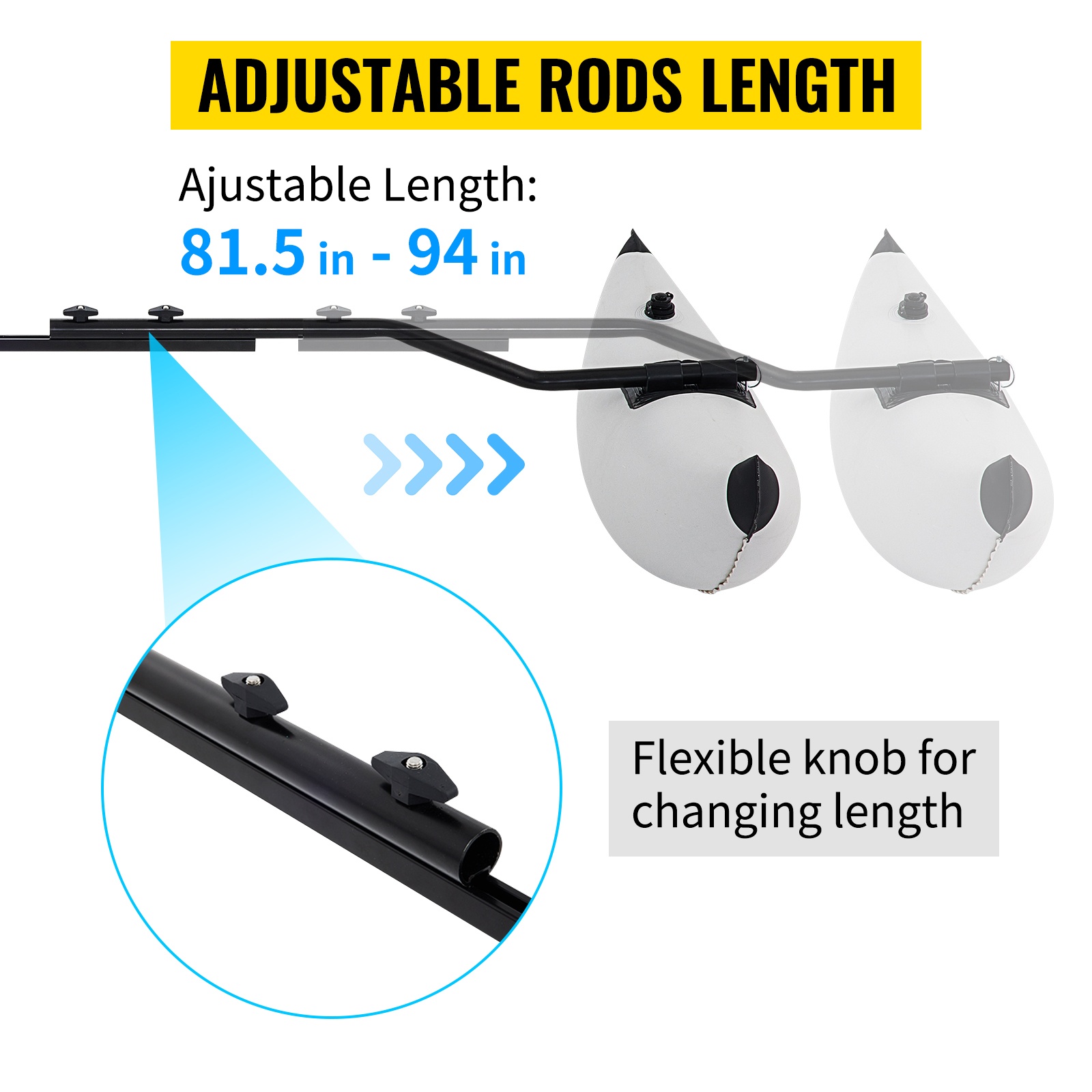 Yhdystangossa on valmiiksi poratut reiät pituuden säätöä varten. Näin sivukellukkeet voidaan asettaa sopivalle etäisyydelle kajakista tai kanootista. Säädettävä pituus: 81.5–94 tuumaa.