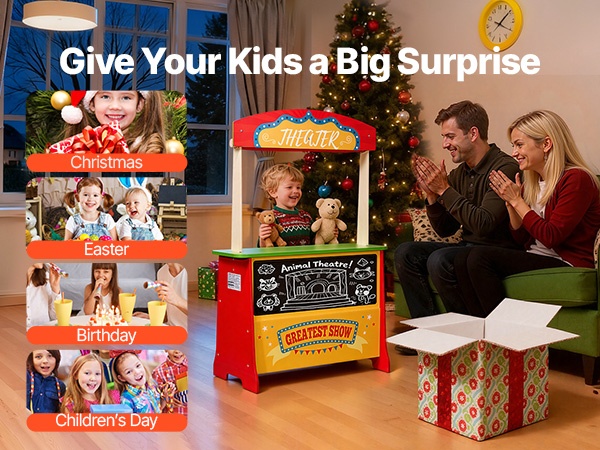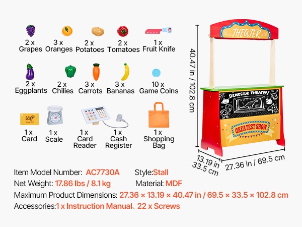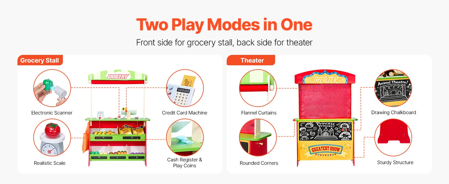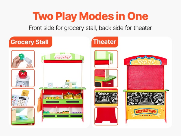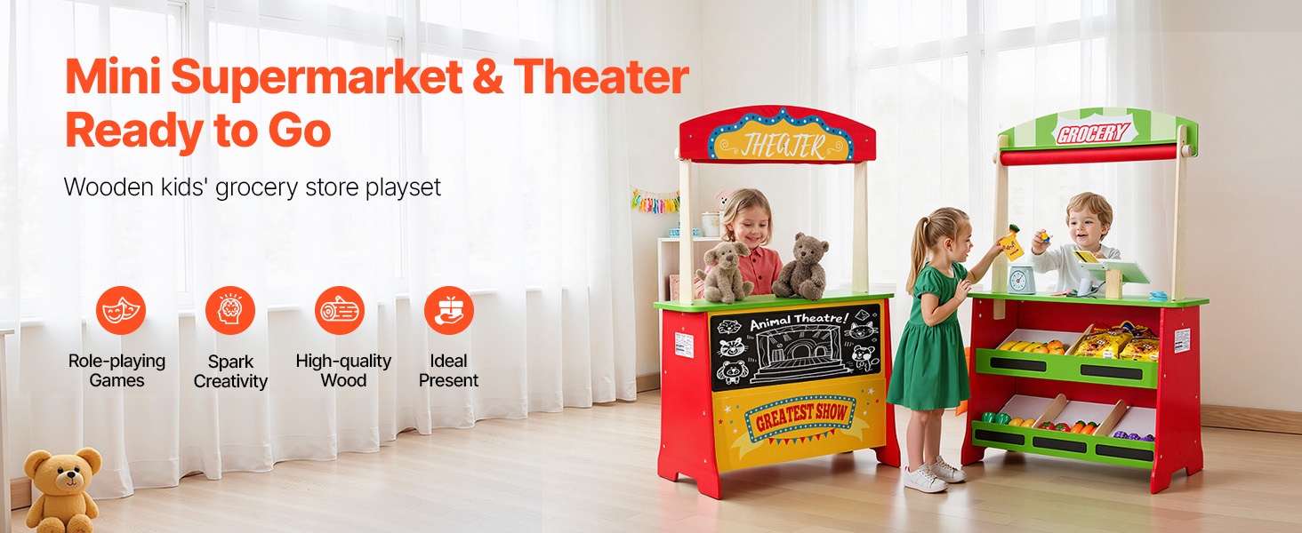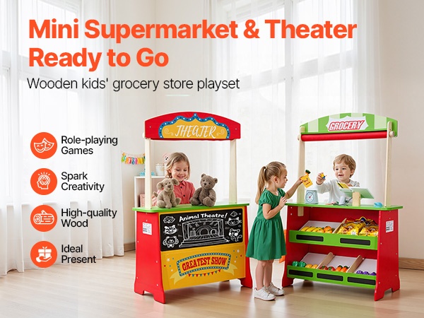 Tämä kaksipuolinen puinen leikkikauppa tarjoaa lapselle sekä pienen marketin että oman esityslavan. Monipuoliset leikkitoiminnot, realistiset tarvikkeet ja tukeva puinen rakenne tarjoavat runsaasti tekemistä leikkihetkiin.