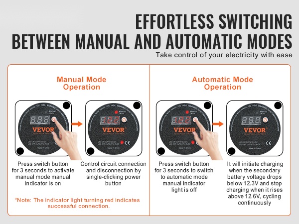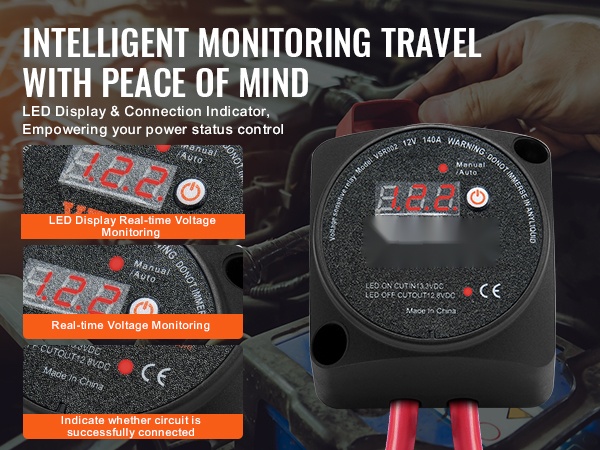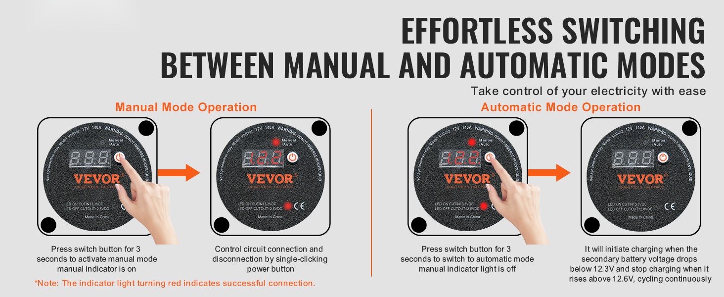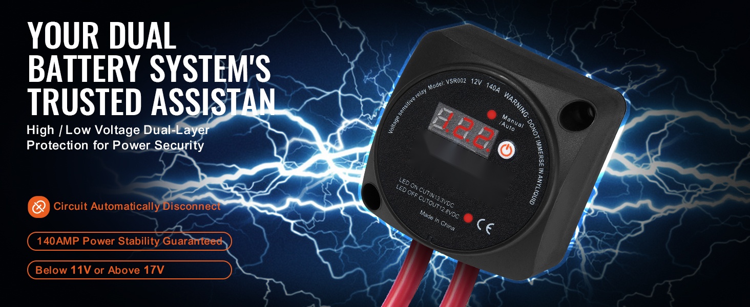 Moniakkujärjestelmiin suunniteltu relepaketti helpottaa ajoneuvosi sähköpiirin hallintaa. Voit valita manuaalisen tai automaattisen tilan tarpeen mukaan, ja selkeä LED-näyttö näyttää akun tilan reaaliaikaisesti. Ylijännite- ja alijännitesuoja lisäävät turvallisuutta ja pidentävät akkujen käyttöikää.
