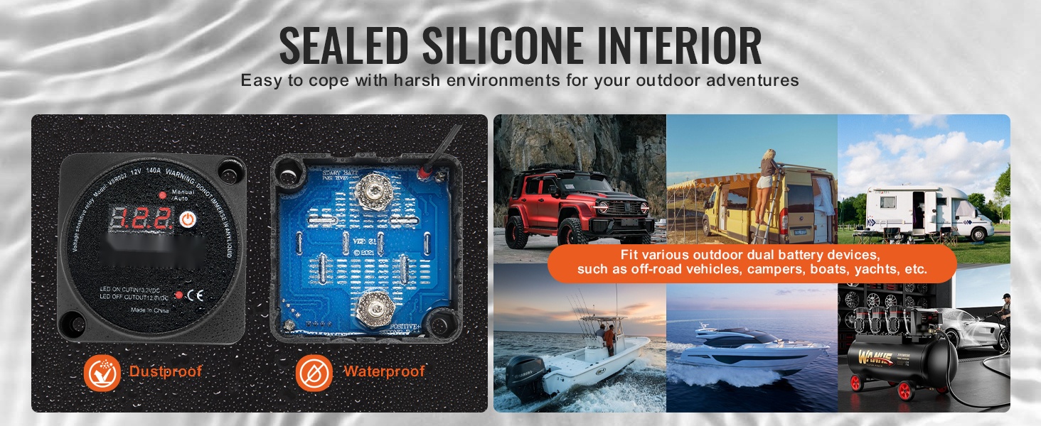 Kaksoisakun erottaja 12V 140A LED-näytöllä silikonitiivisteellä manuaalisella ja automaattisella tilalla