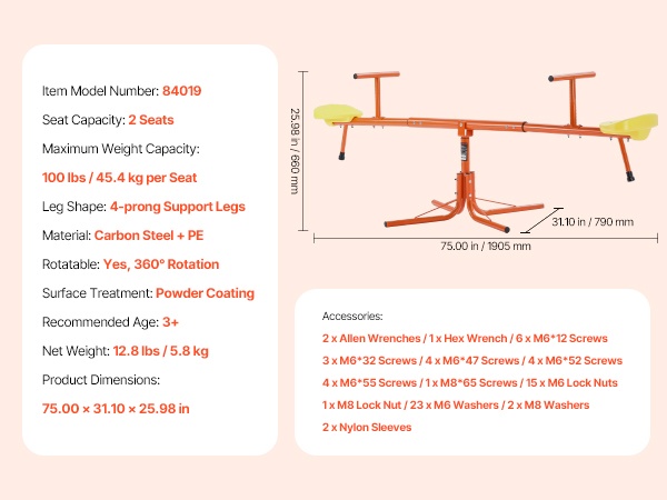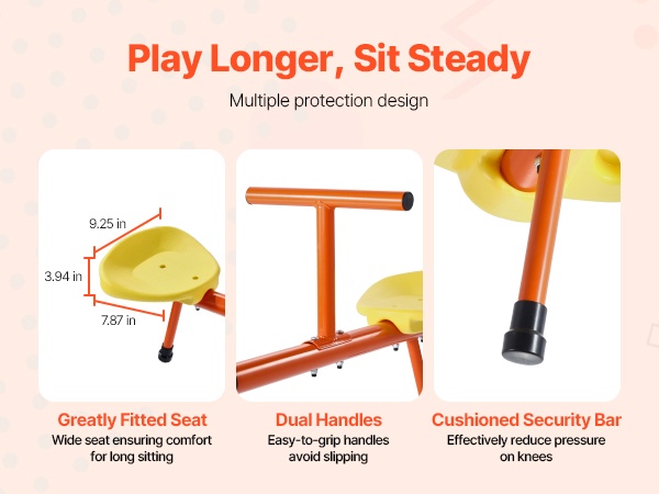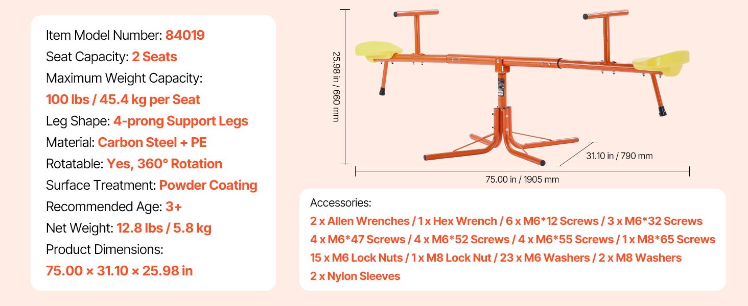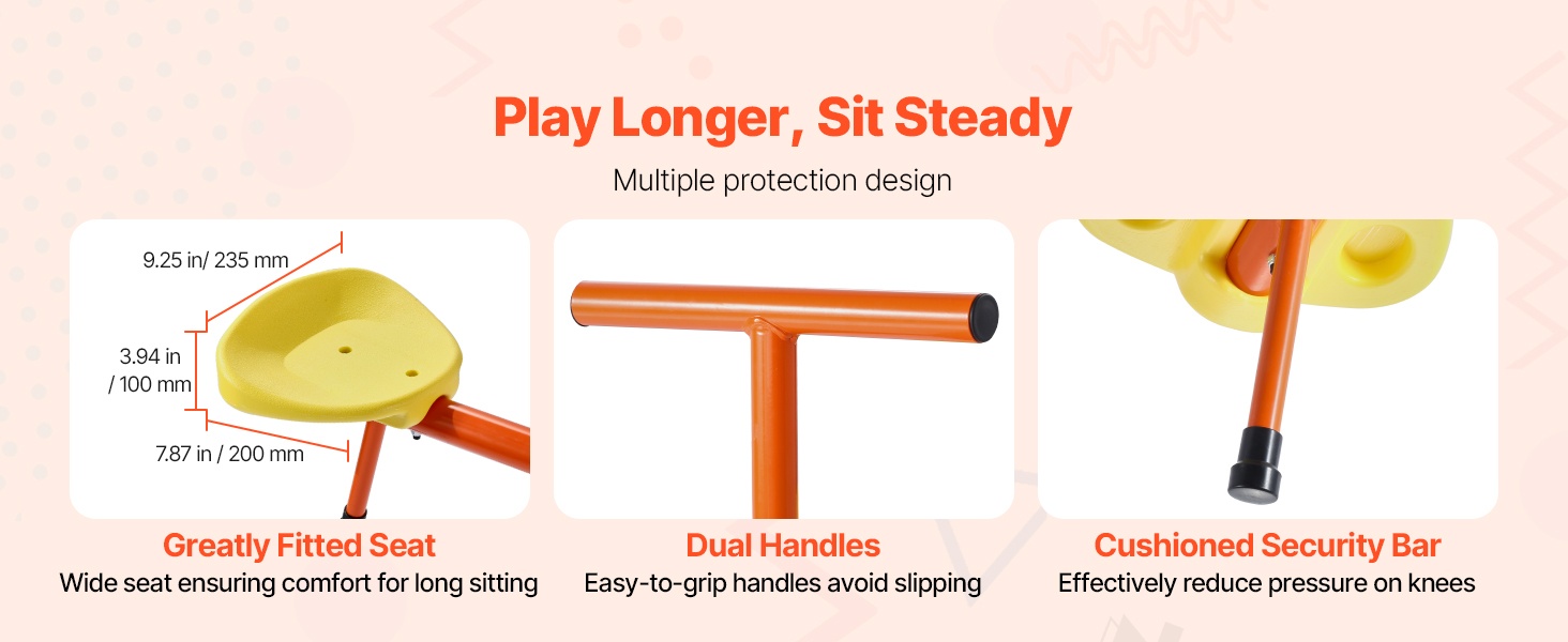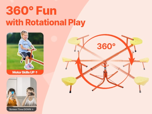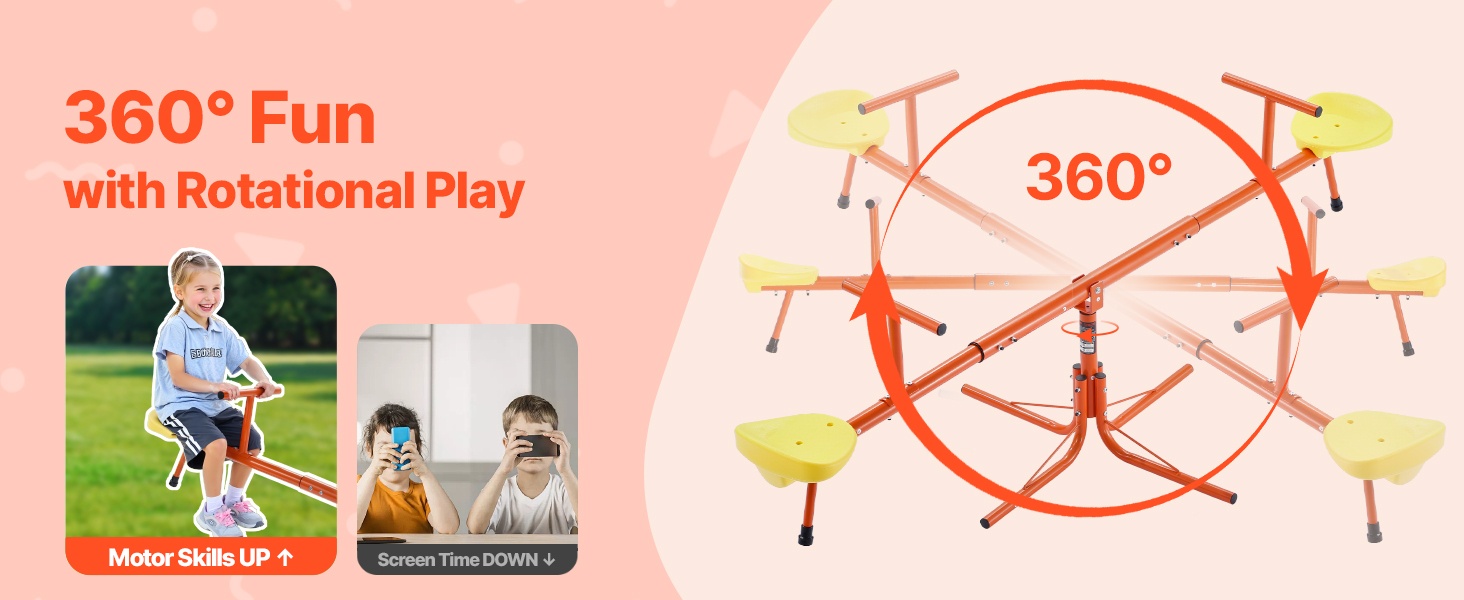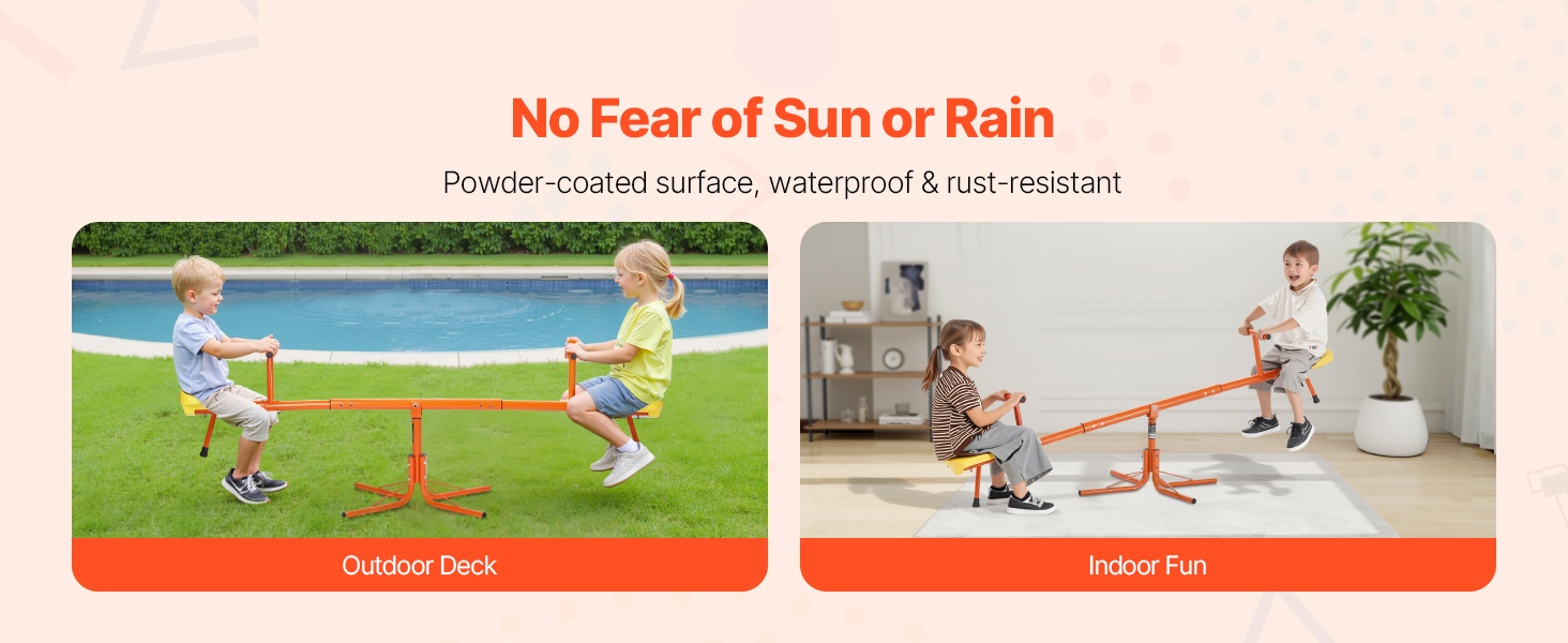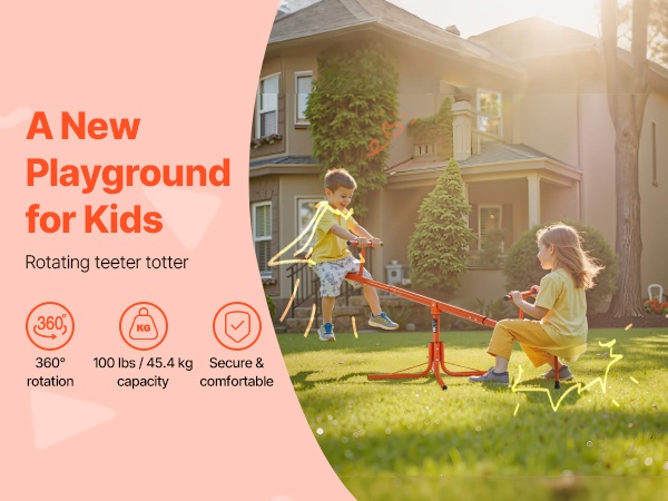 Tämä metallinen kaksoiskeinulauta on suunniteltu kahdelle lapselle. Kestävä hiiliteräsrakenne kestää jopa 300 lbs / 136 kg kuorman, ja 360° pyörivä rakenne antaa lasten keinua ylös ja alas samalla pyörien, mikä lisää leikin iloa ja vaihtelua.