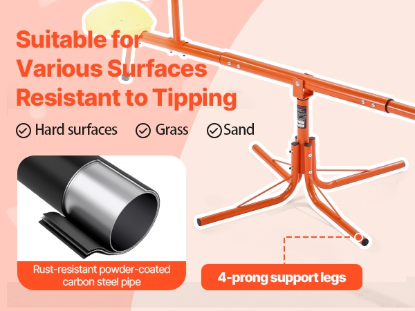 Suurialaiset tukijalat ja laadukkaat jauhemaalatut teräsputket pitävät keinulaudan tukevasti paikoillaan nurmikolla, hiekalla tai betonilla. Lapset voivat leikkiä rauhassa ilman jatkuvaa kaatumisen pelkoa.